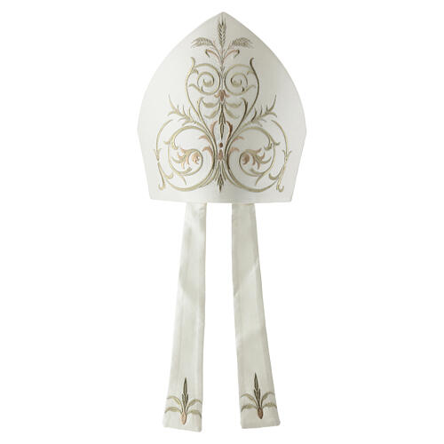 Mitra zdobiona jest bogatym haftem wykonanym w całości złotą nicią. Wzór obejmuje klasyczne woluty, ornament roślinny oraz motyw kłosów, rozmieszczone na przednim panelu i harmonijnie przechodzące na infuły. Zestawienie złotego haftu z tkaniną w odcieniu kości słoniowej nadaje nakryciu głowy dostojny, ceremonialny charakter odpowiedni dla celebracji biskupich.