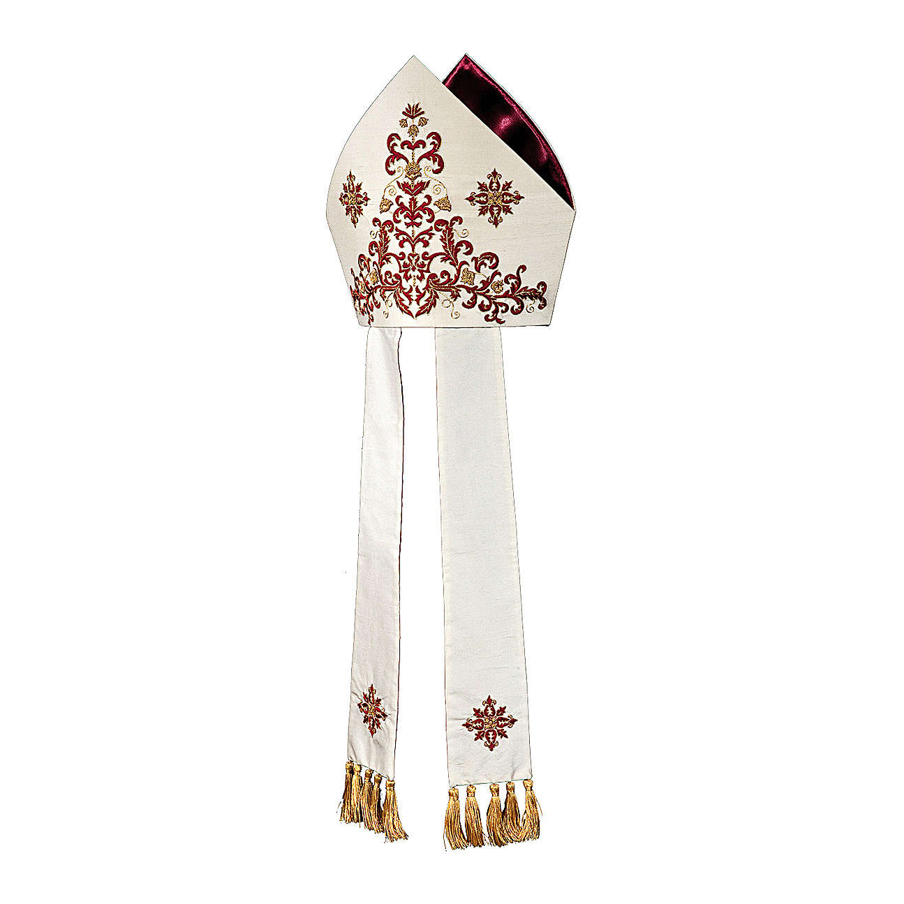 Mitra z bawełny jedwabiu, HAFTOWANA W CAŁOŚCI RĘCZNIE, z frędzlami z bajorka (szychu).