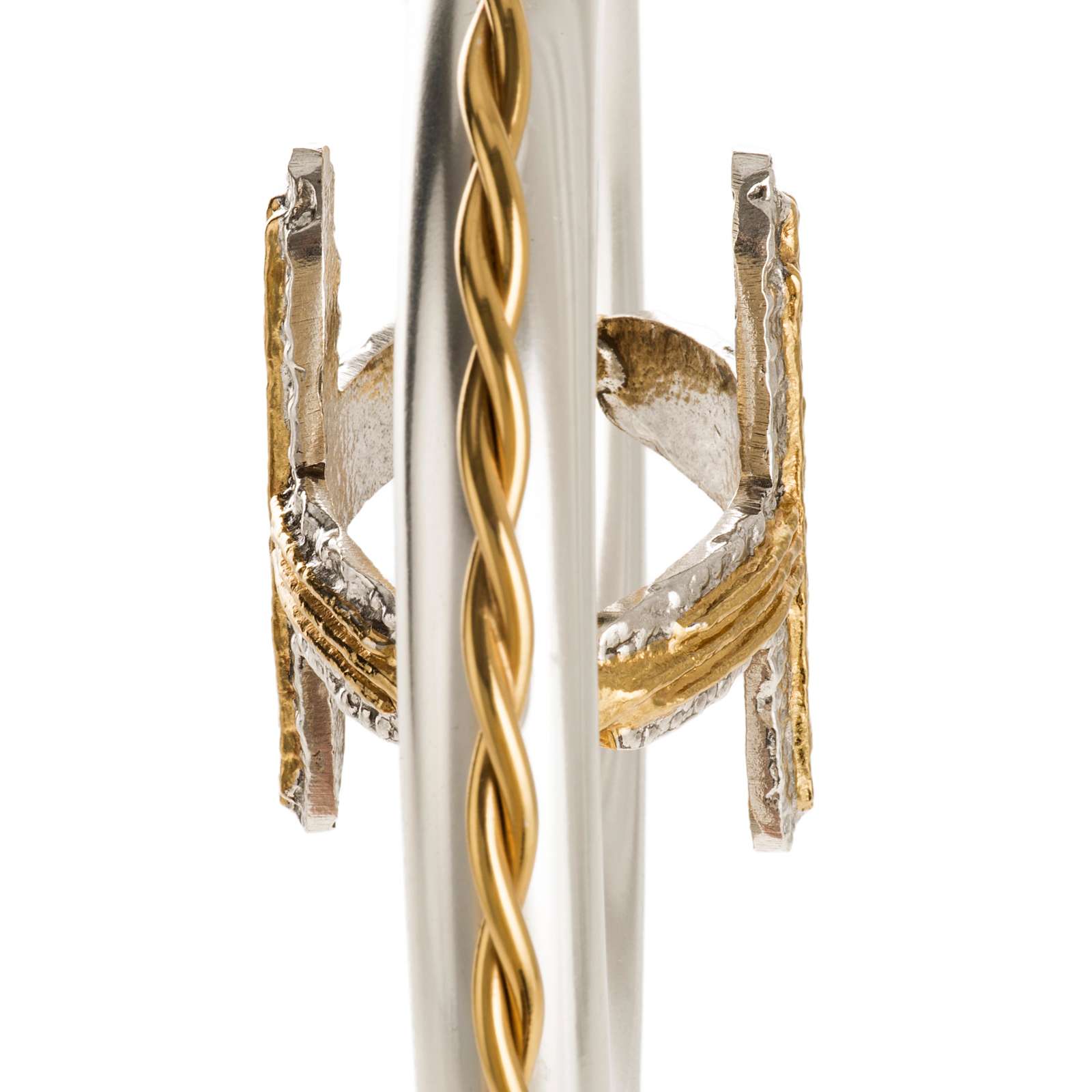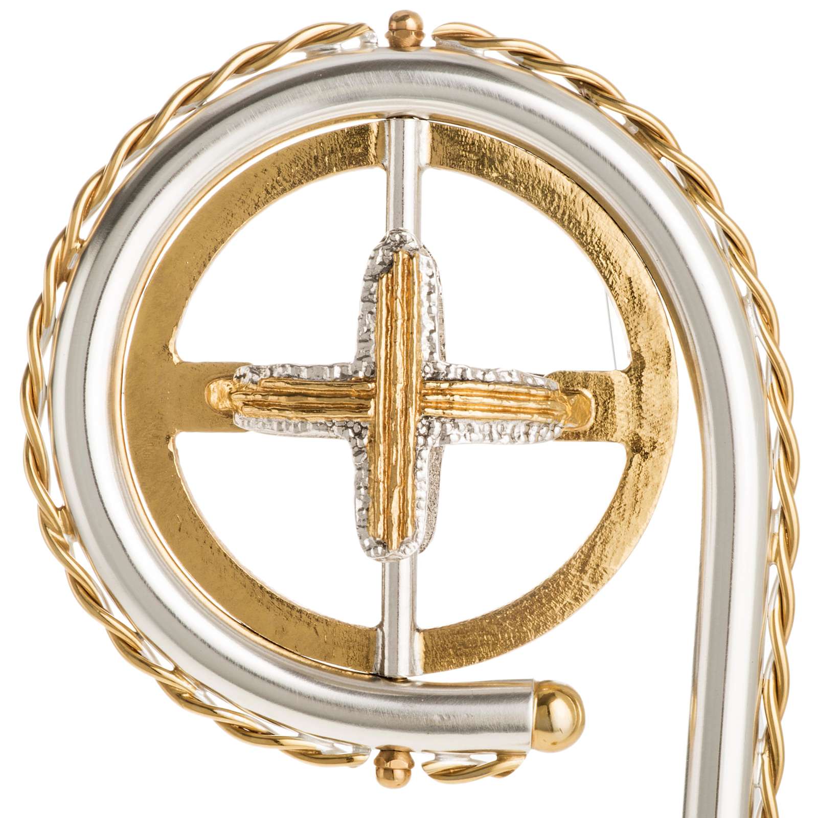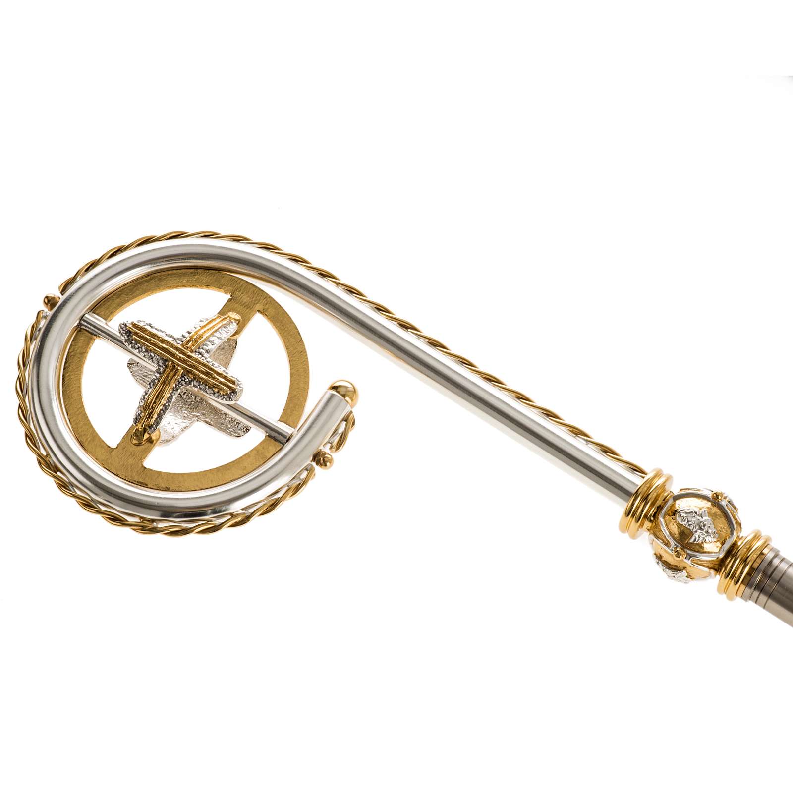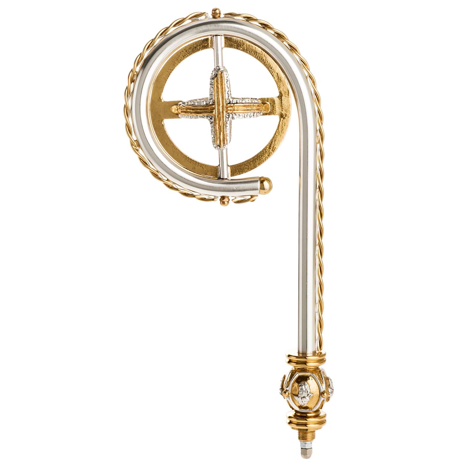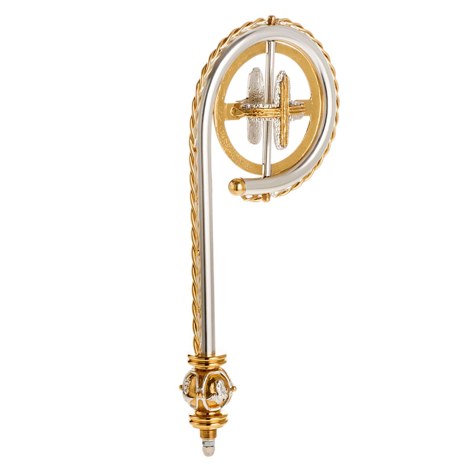 Drążek i krzywaśnia wykonane są z mosiądzu. Na splocie widnieją wizerunki w reliefie 4 ewangelistów. Na spirali widnieje również pozłacany krzyż.