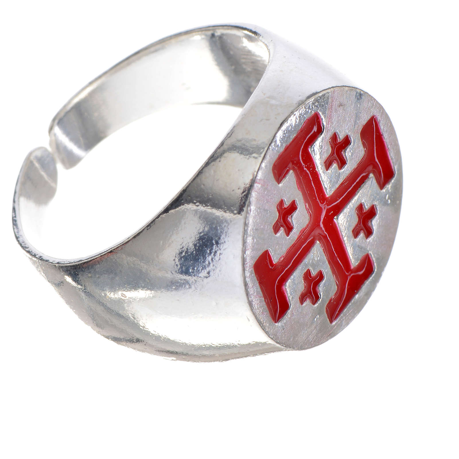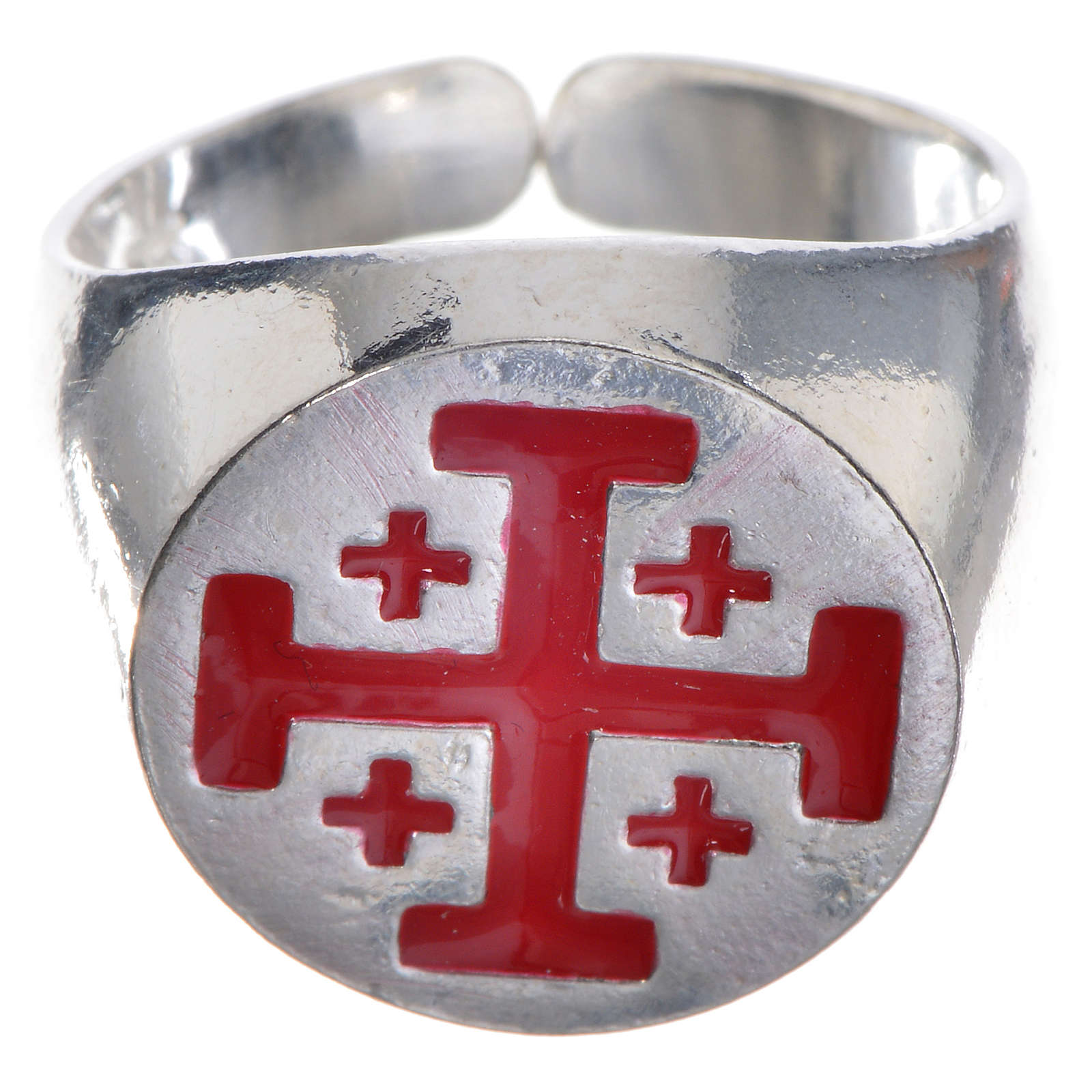 Pierścień biskupi ze srebra 925, z krzyżem jerozolimskim z czerwonej emalii.