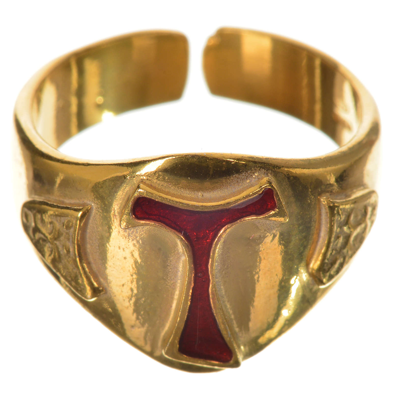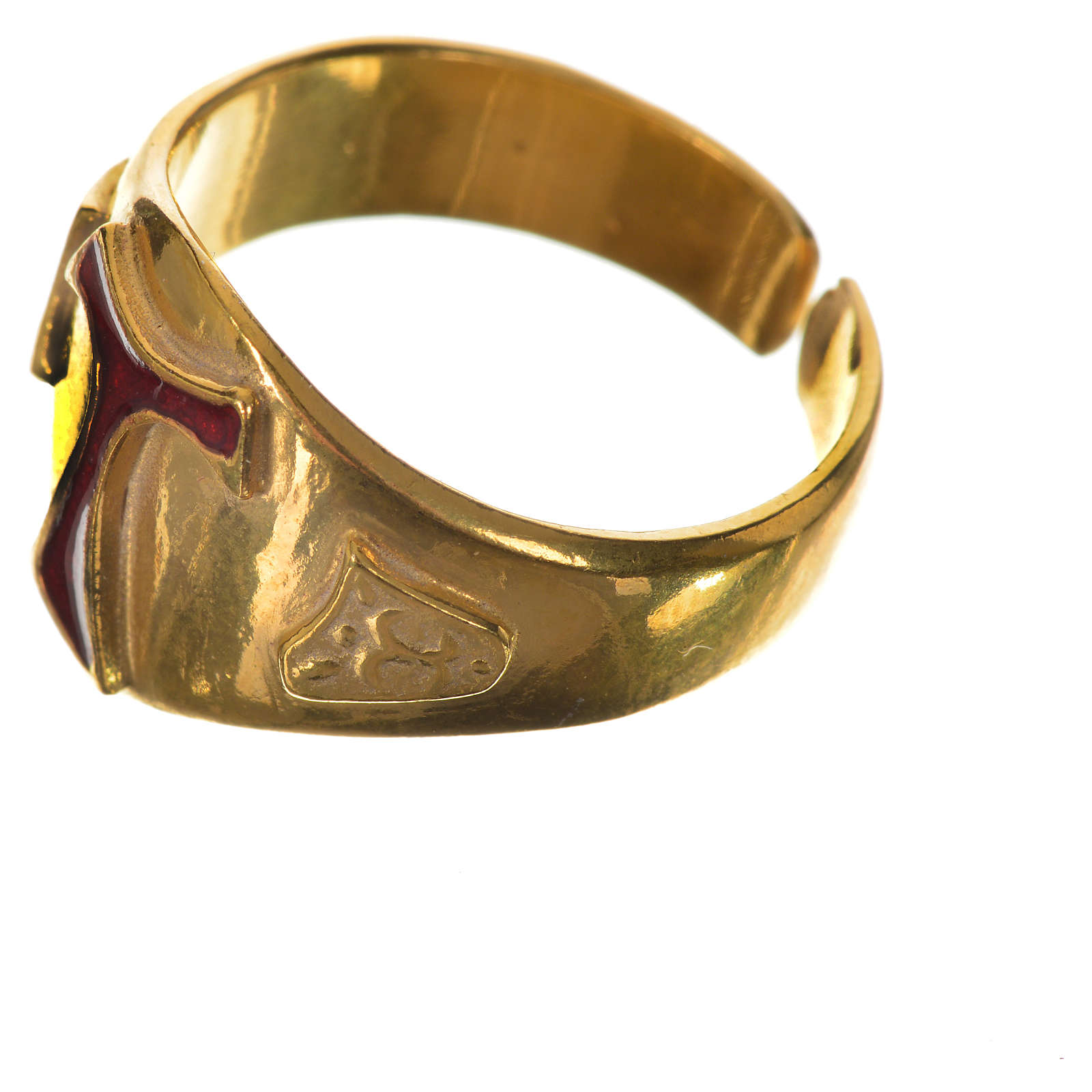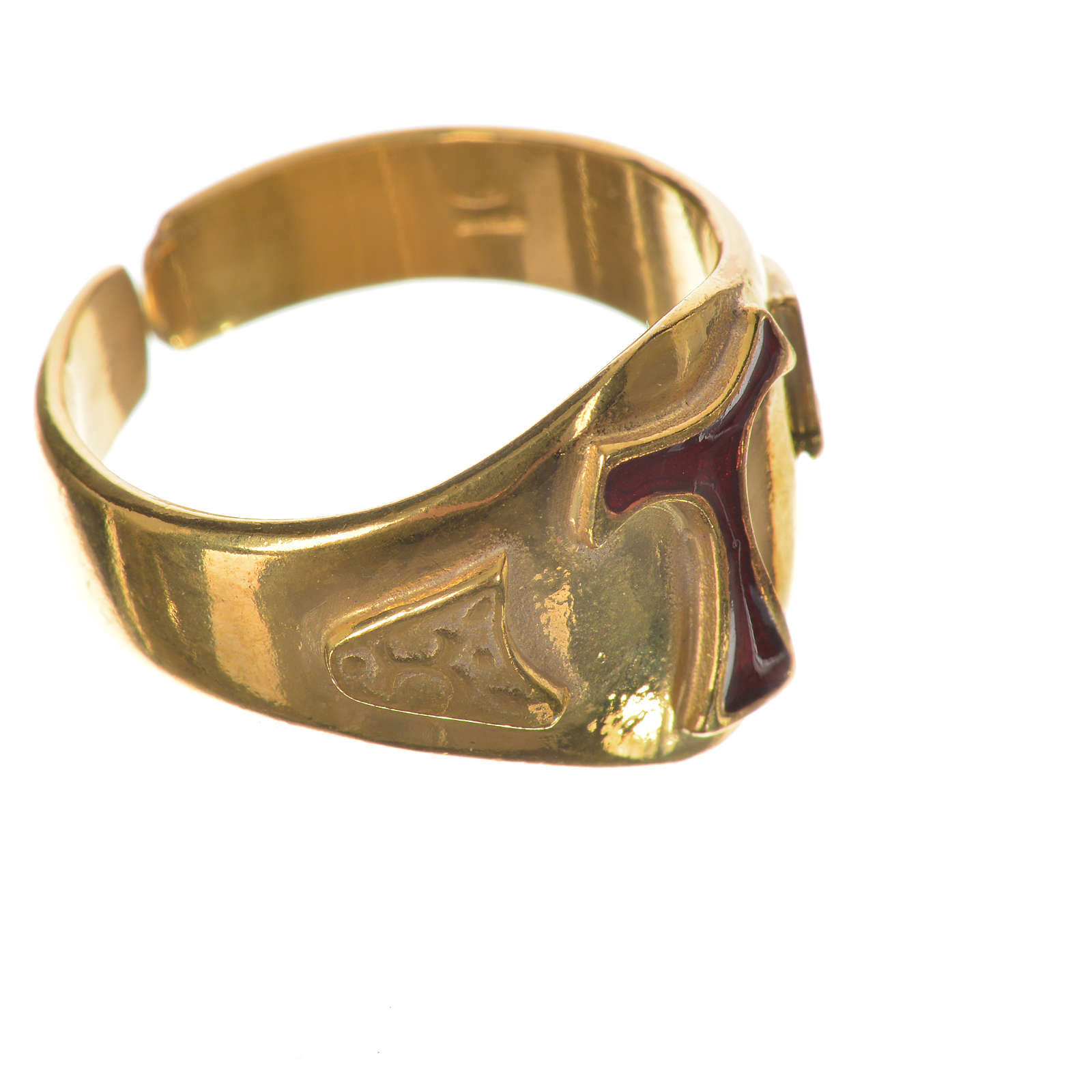 Pierścień biskupi srebro 925 złocone i tau emaliowany czerwonego koloru.