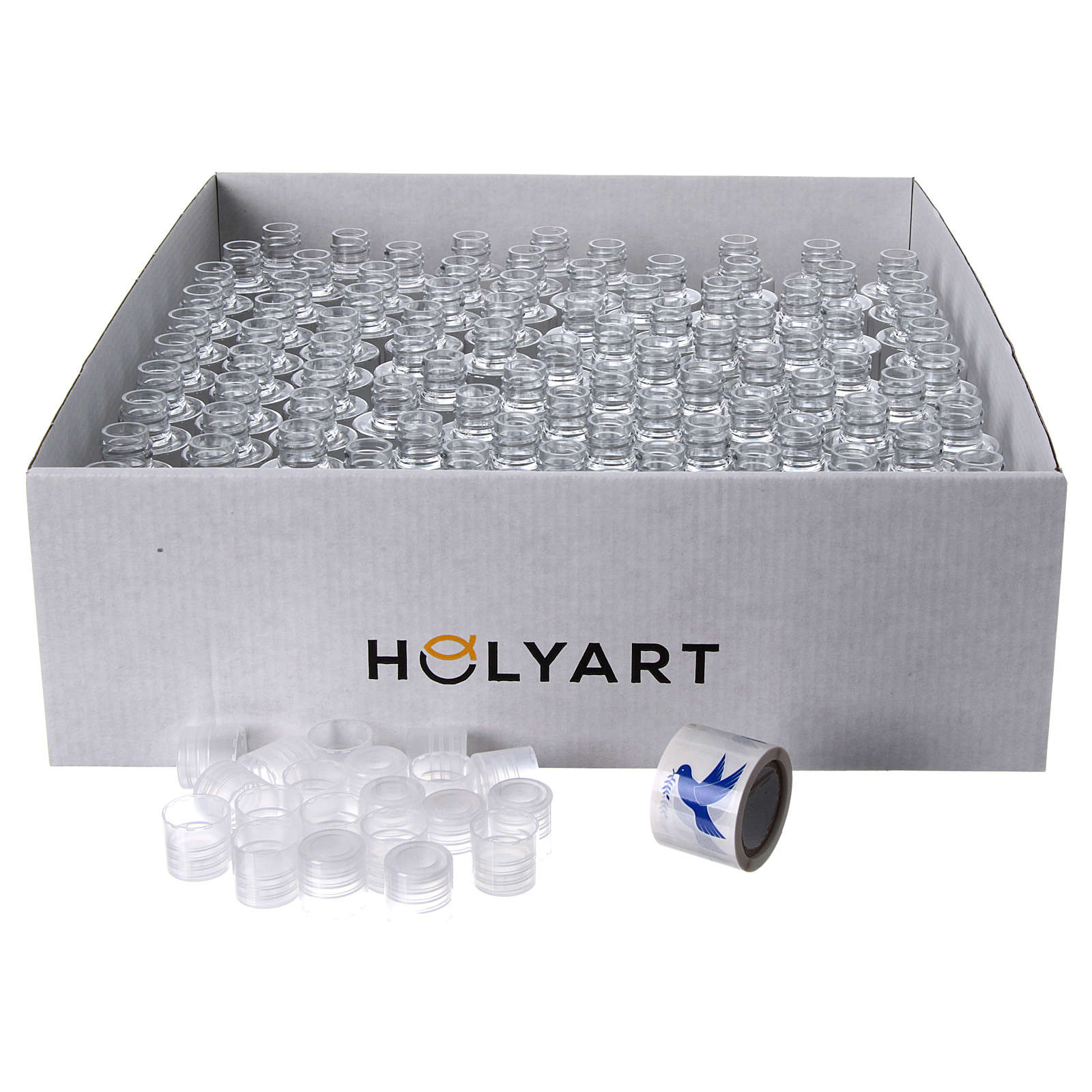Buteleczki na wodę święconą z plastiku o pojemności 55 ml z wizerunkiem gołębicy. Dostarczone jako zestaw 100 sztuk w eleganckim pudełku składanym za pomocą wykrojnika.