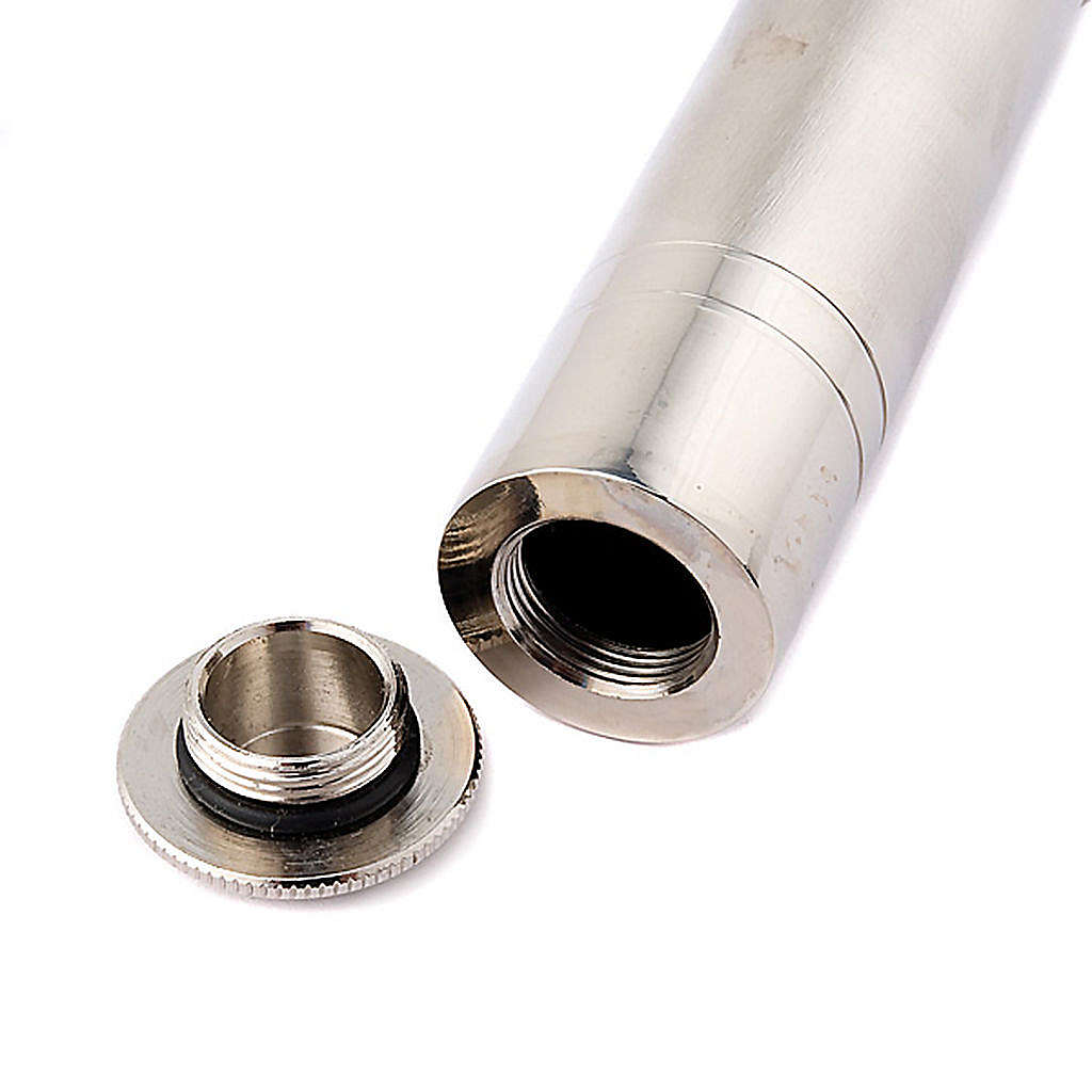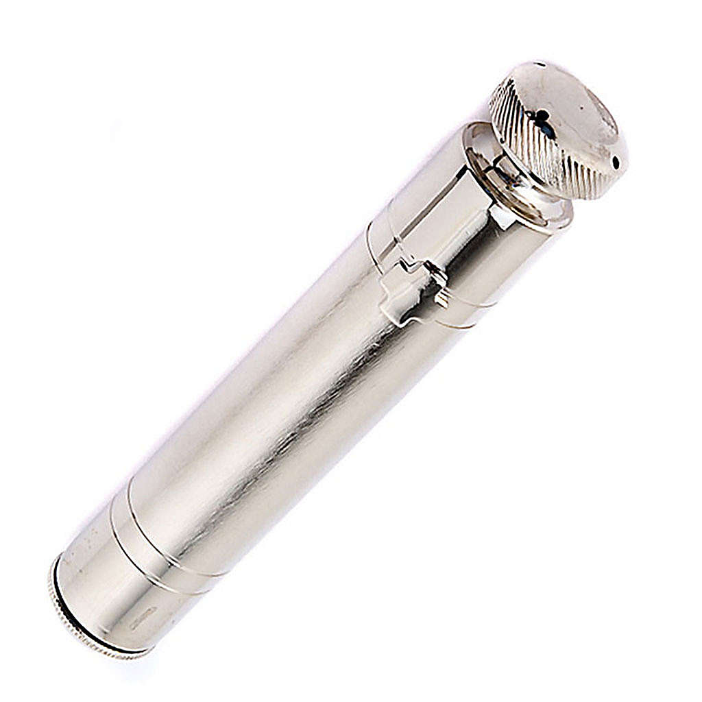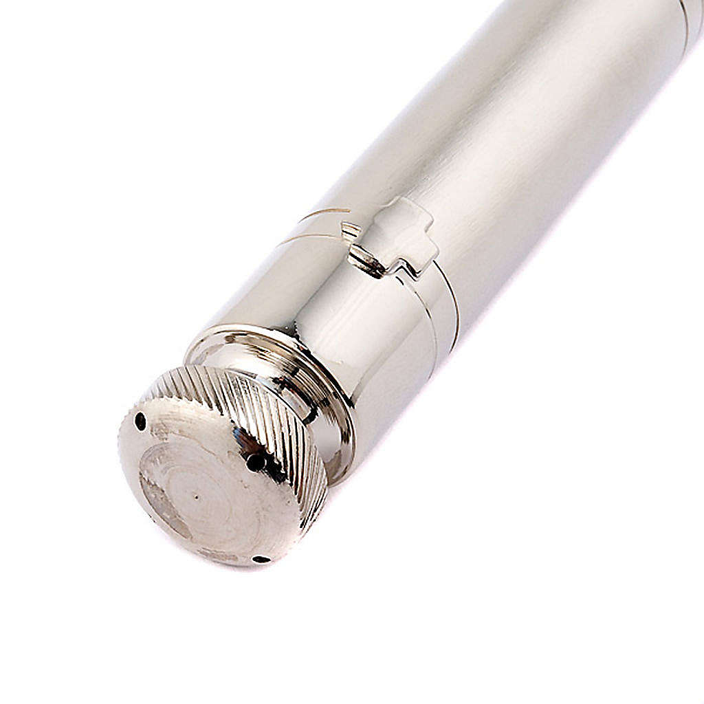 Podręczne kropidło z chromowanej stali (pojemność ok.40 cc) z uszczelniającym korkiem na końcu i regulowanym strumieniu wody święconej. Na kropidle widnieje wizerunek małego krzyża ze stali.