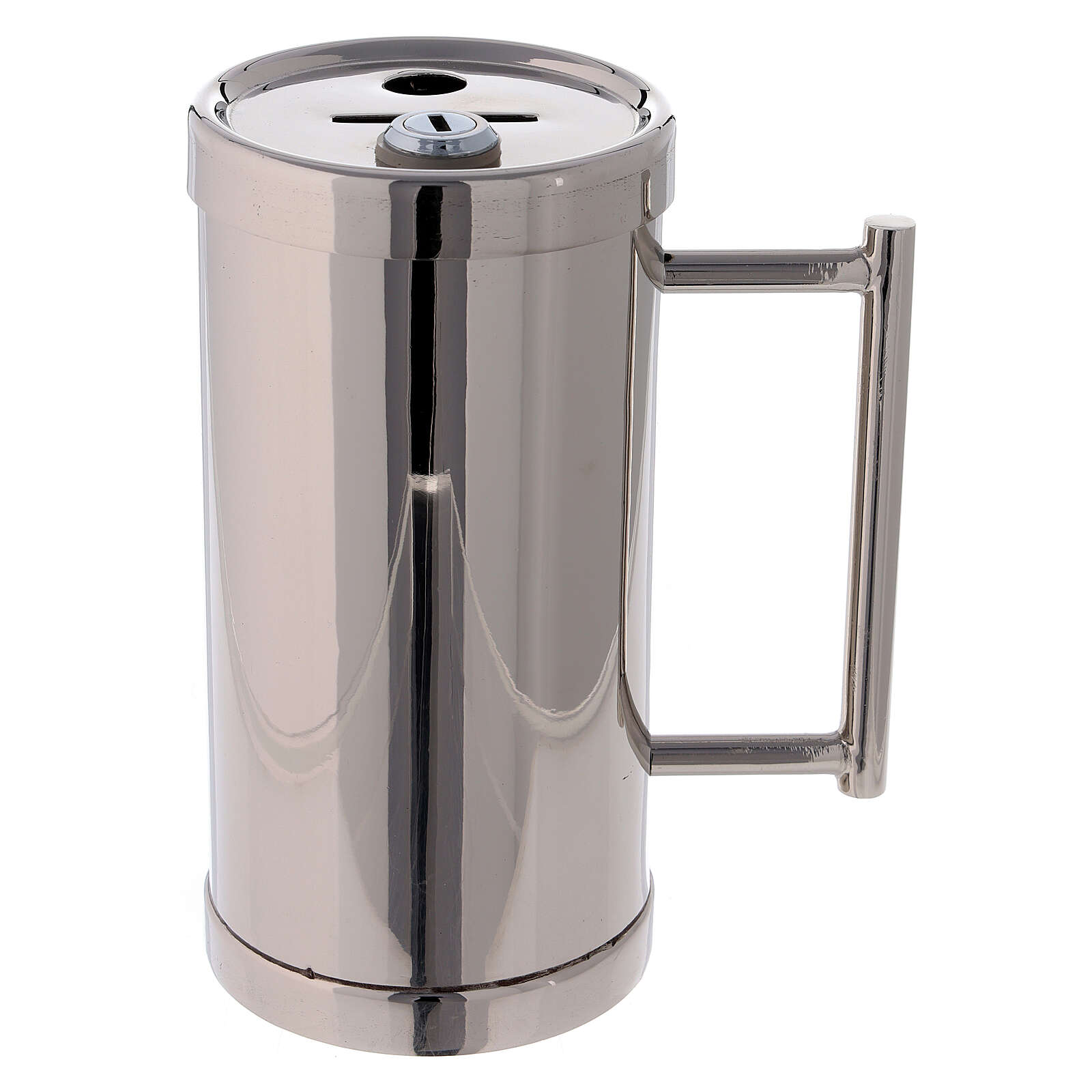 Puszka na oferty kościelne zrealizowana z niklowanego mosiądzu z wykończeniem polerowanym. Pojemnik posiada praktyczny kwadratowy uchwyt i otwory na banknoty i monety. Jest wyposażony w zamek i klucz do niego.