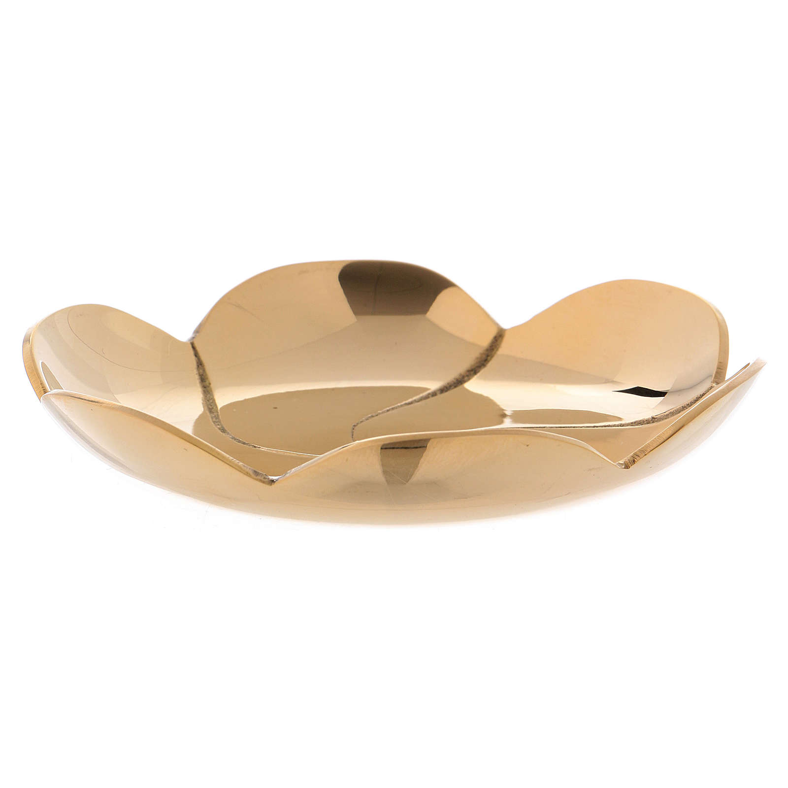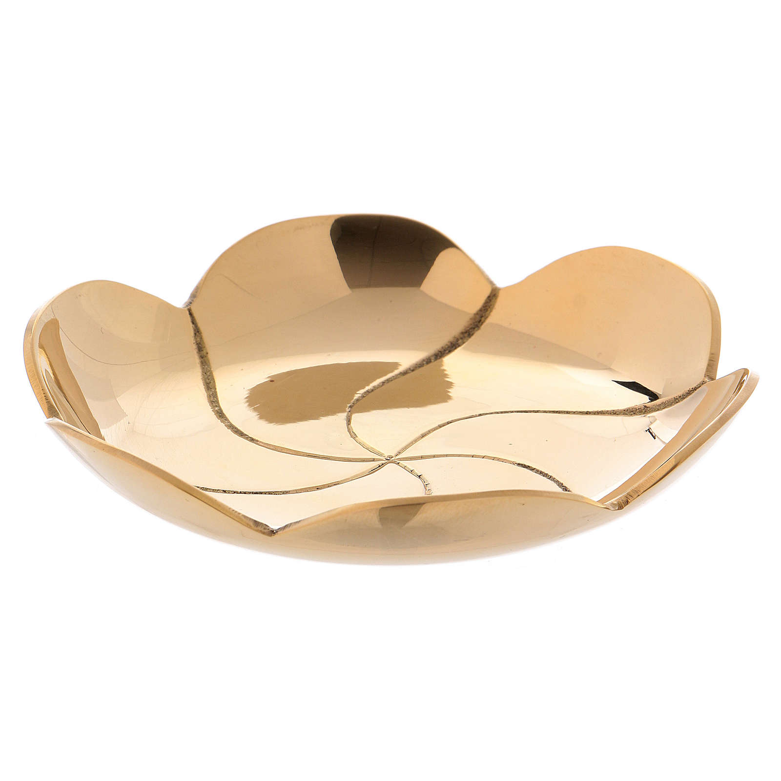 Talerzyk zrealizowany z mosiądzu, pozłacany, polerowany i o szczególnym kształcie przypominającym kwiat lotosu.