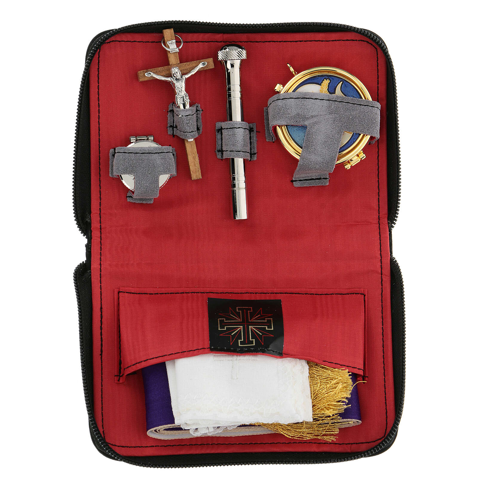 Aktówka ta posiada eleganckie i praktyczne zapięcie na suwak. Na zewnątrz jest wyłożona zamszowym materiałem skóropodobnym, a od wewnątrz czerwonym materiałem. Wyposażona jest w emaliowane cyborium, metalowe kropidło, mały krzyżyk i stułę czyli w akcesoria niezbędne na okoliczność Komunii lub błogosławieństwa.