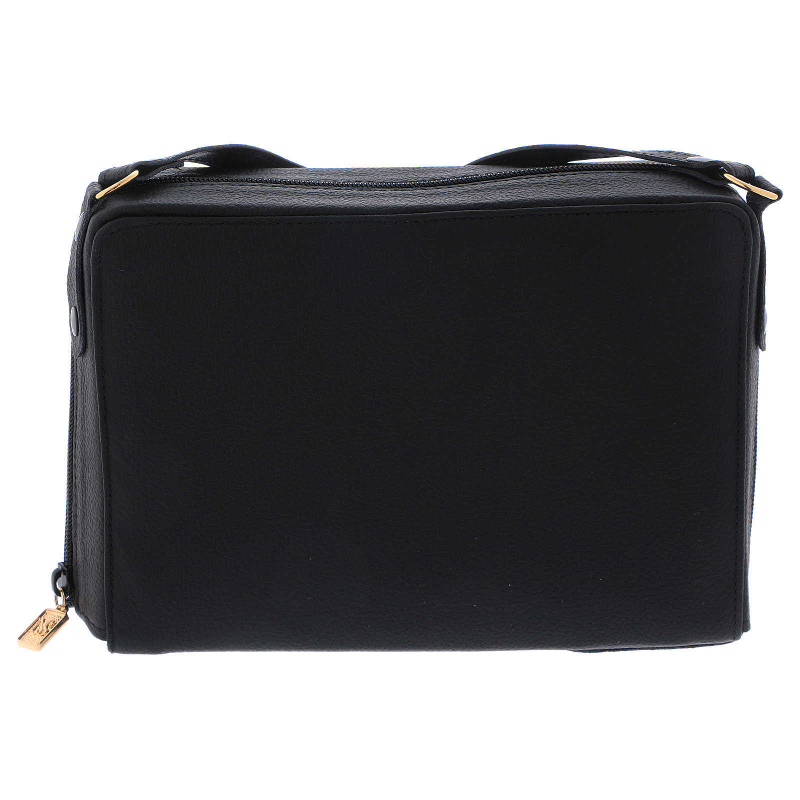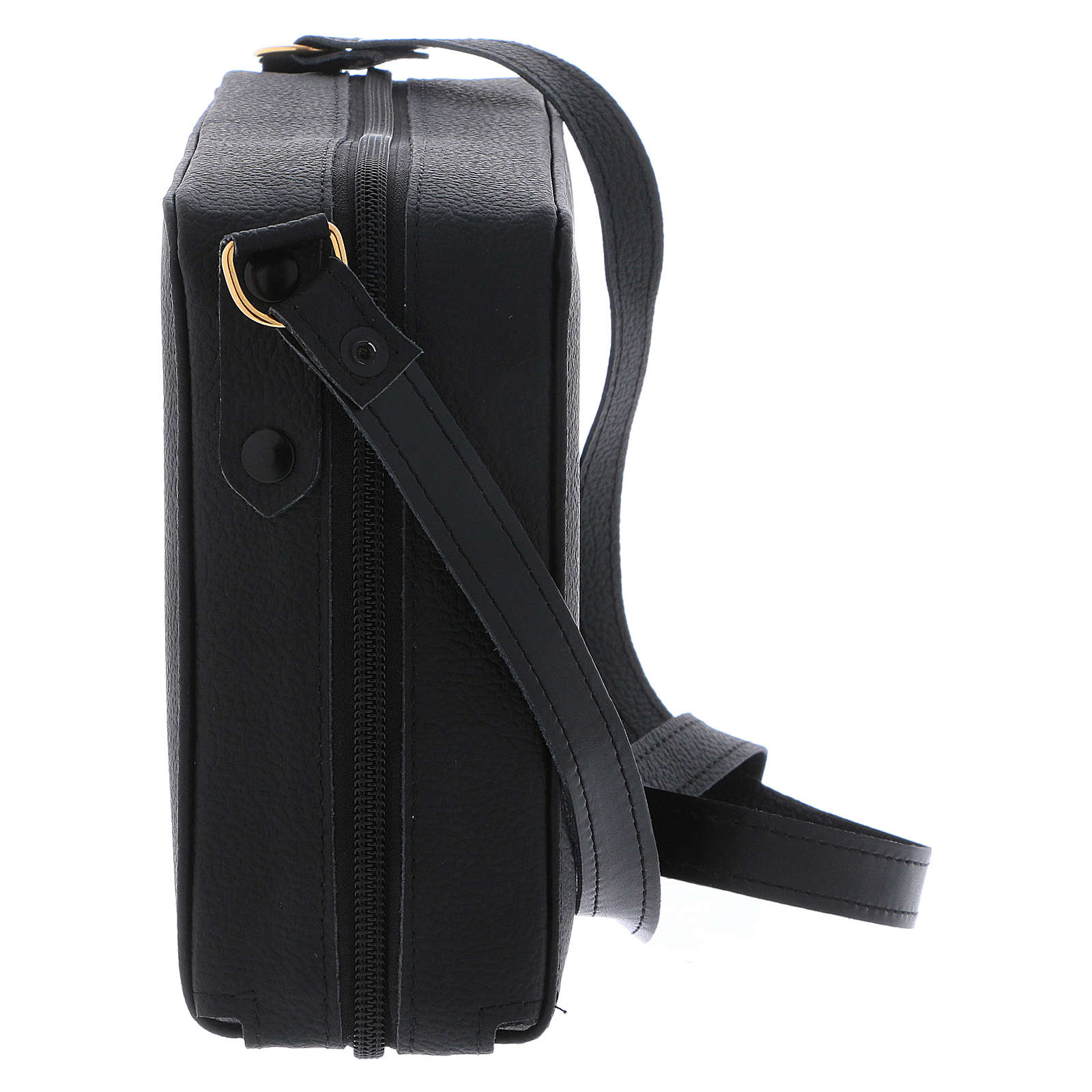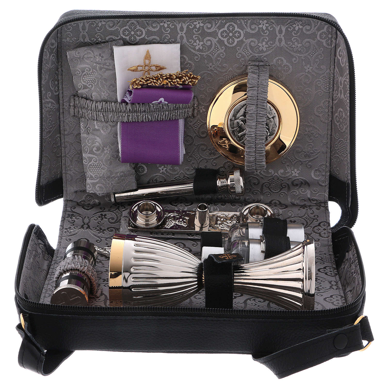 Sprzęt liturgiczny zestaw turystyczny do odprawiania mszy świętej i uroczystości w torbie na ramię skórzanej i z podszewką z szarej satyny.