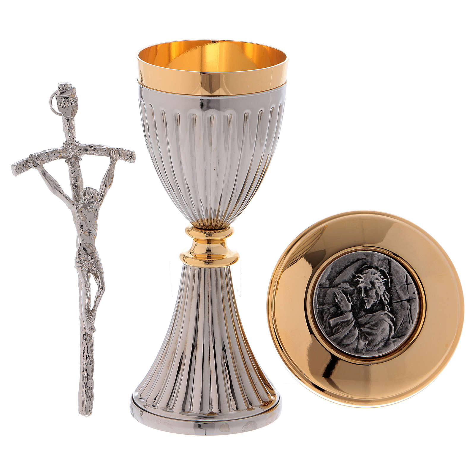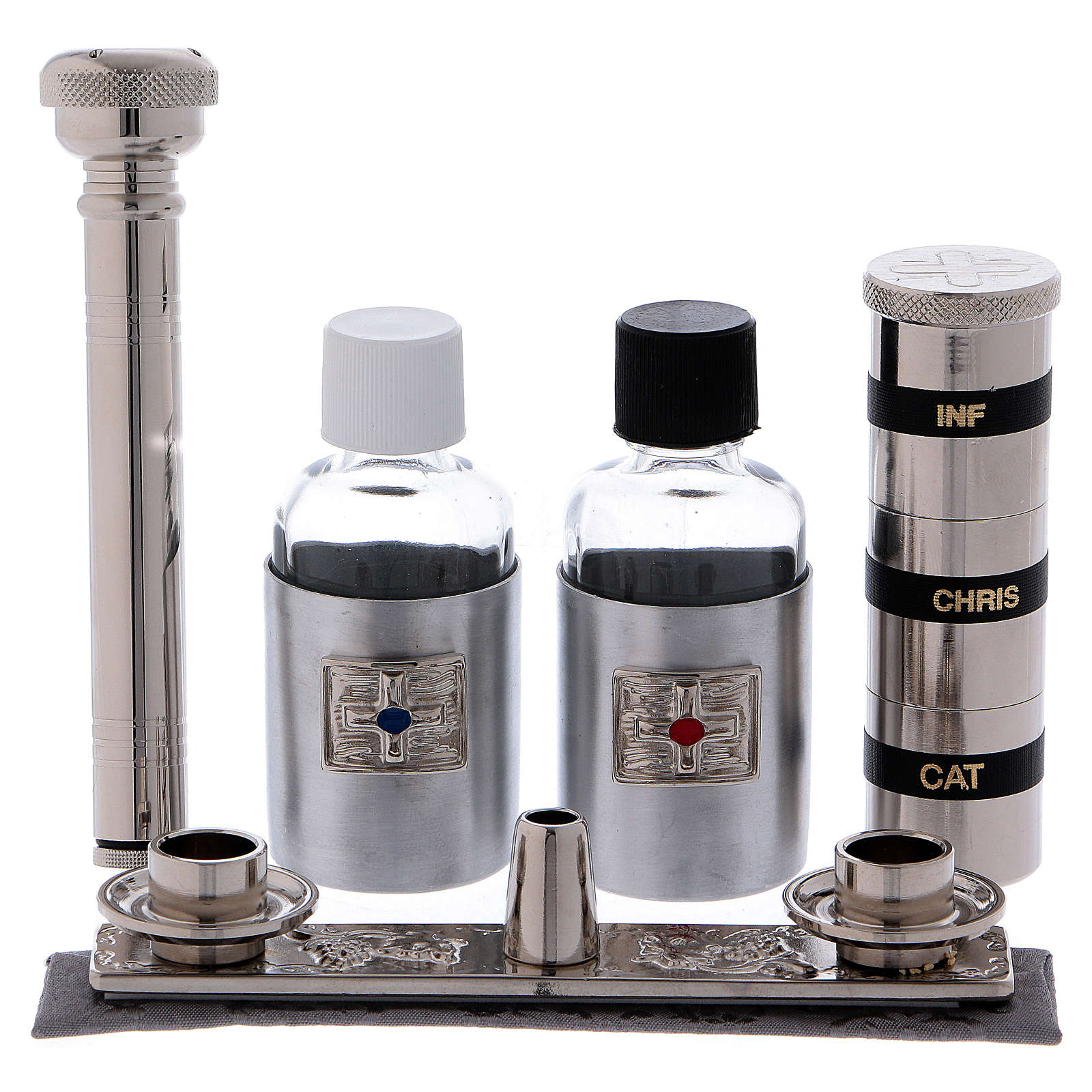 W skład tego zestawu turystycznego wchodzi: kielich z mosiądzu pozłacanego z podstawą, pojemnik na komunikanty z mosiądzu pozłacany i z dekoracyjną blaszką, zestaw puryfikaterzy, potrójne czynie do olejów świętych, patena talerzyk 10 cm średnicy, dwukolorowa mała stuła, 2 buteleczki na wodę i wino 30 cc, kropidło, miseczka o średnicy 8 cm.