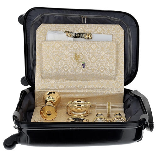 Zestaw zawiera kielich z mosiądzu z pozłacaną 24-karatowym złotem martelowaną powierzchnią o wysokości 13,5 cm i średnicy 8 cm, palkę, patenę z odlewaną podstawą o średnicy 9 cm, kropidło, naczynko na oleje o średnicy i wysokości 3 cm, patenę kielichową z ozdobną płytą o średnicy 8 cm, odlewany ołtarzyk z krzyżem i świeceką, szklaną osłonkę płomienia, dwie buteleczki na wodę i wino o pojemności 125 ml, krzyż pasterski, dwie świeczki woskowe, stoletę dwukolorową i komplet obrusu z haftowaną krzyżem.