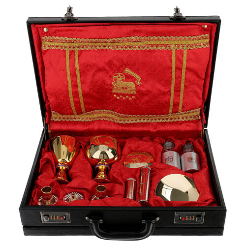 Wewnątrz elegancki czerwony aksamit z wyhaftowanym złotem barankiem na siedmiu pieczęciach.