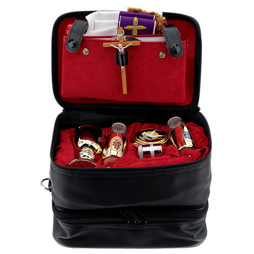 W komplecie znajduje się kielich z mosiądzu w złoceniu, dwie butelki na wodę i wino z oznaczeniami na etykiecie, patena z mocowaniem do cząstek, teca na hostie z emaliowaną pokrywą z wizerunkiem gołębicy, wazka na oleje chorych, kropidło, ołtarzyk z krzyżem drewniano-metalowym i podstawami na dwie świeczki, stoletta dwukolorowa z frędzlami, oraz trzy różnej wielkości tkaniny: purificatoio, manutergio i korporał.