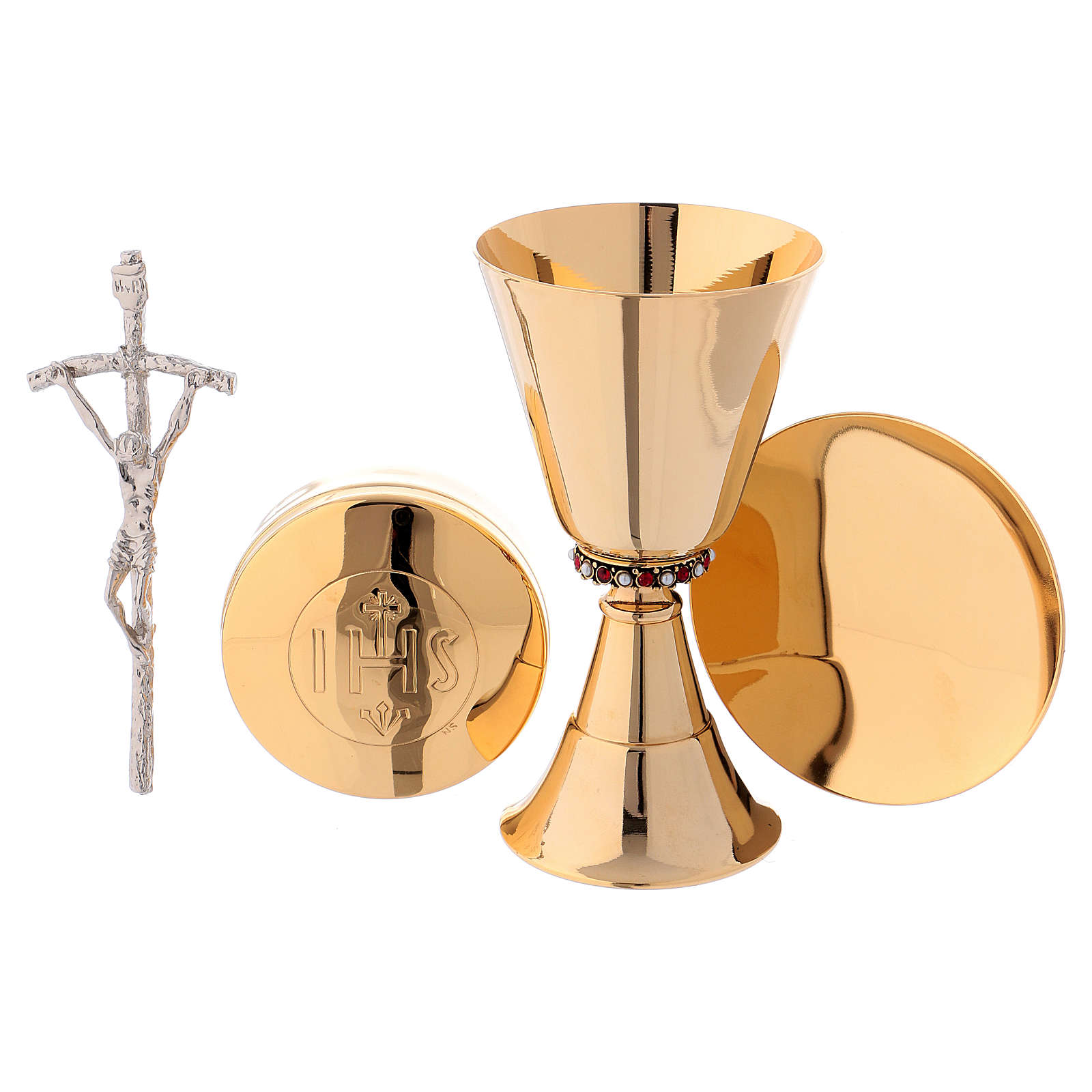 W torbie mieści się kielich z mosiądzu, pozłacany i z wykończeniem klepanym młotkiem o średnicy 15 cm, czara o średnicy 8 cm, hostiarka o średnicy 8 cm, komunikanty z IHS, puryfikaterz 100% bawełna, patena 10 cm, stuła dwukolorowa, dwie buteleczki na wodę i wino, ołtarzyk, dwie świeczki i krzyż.