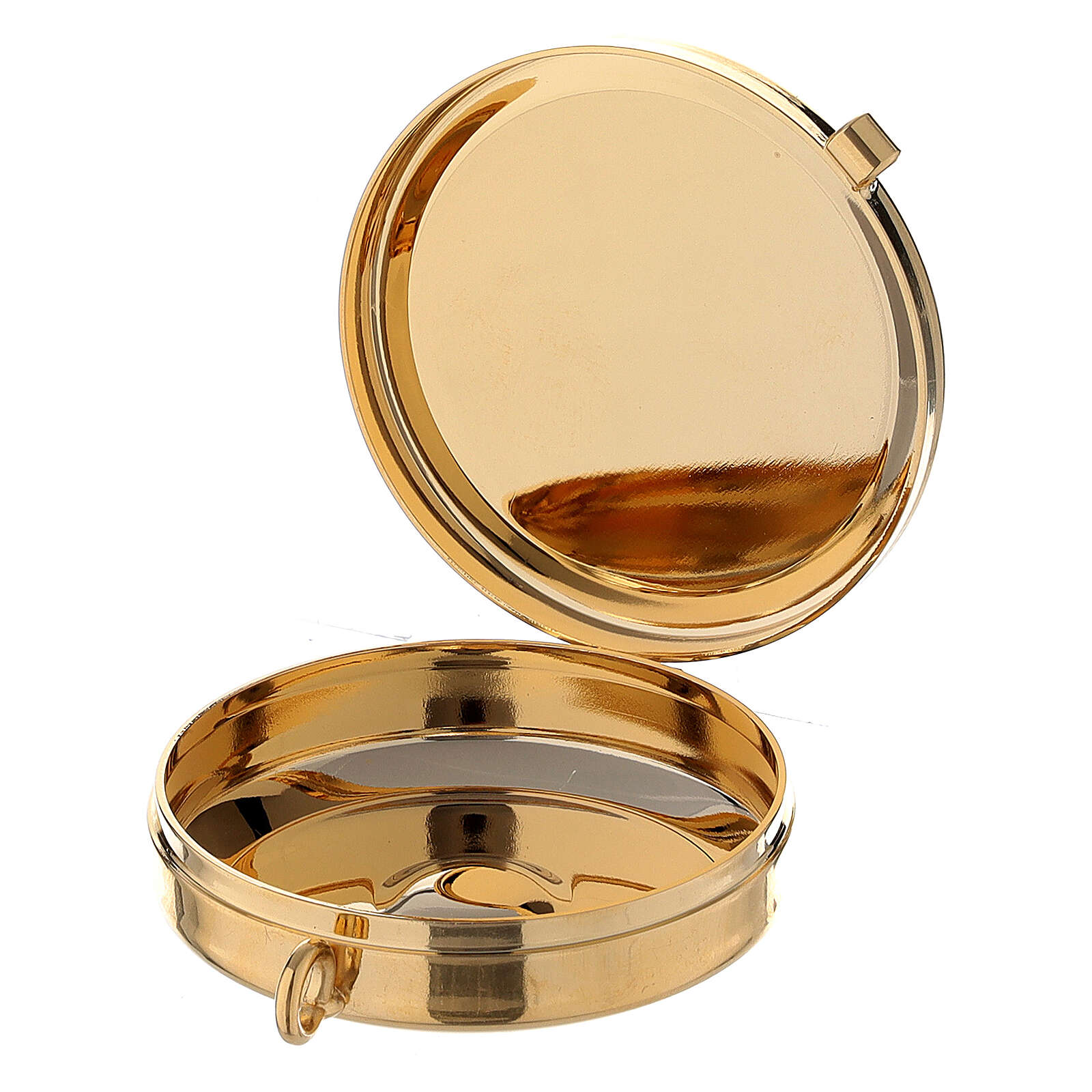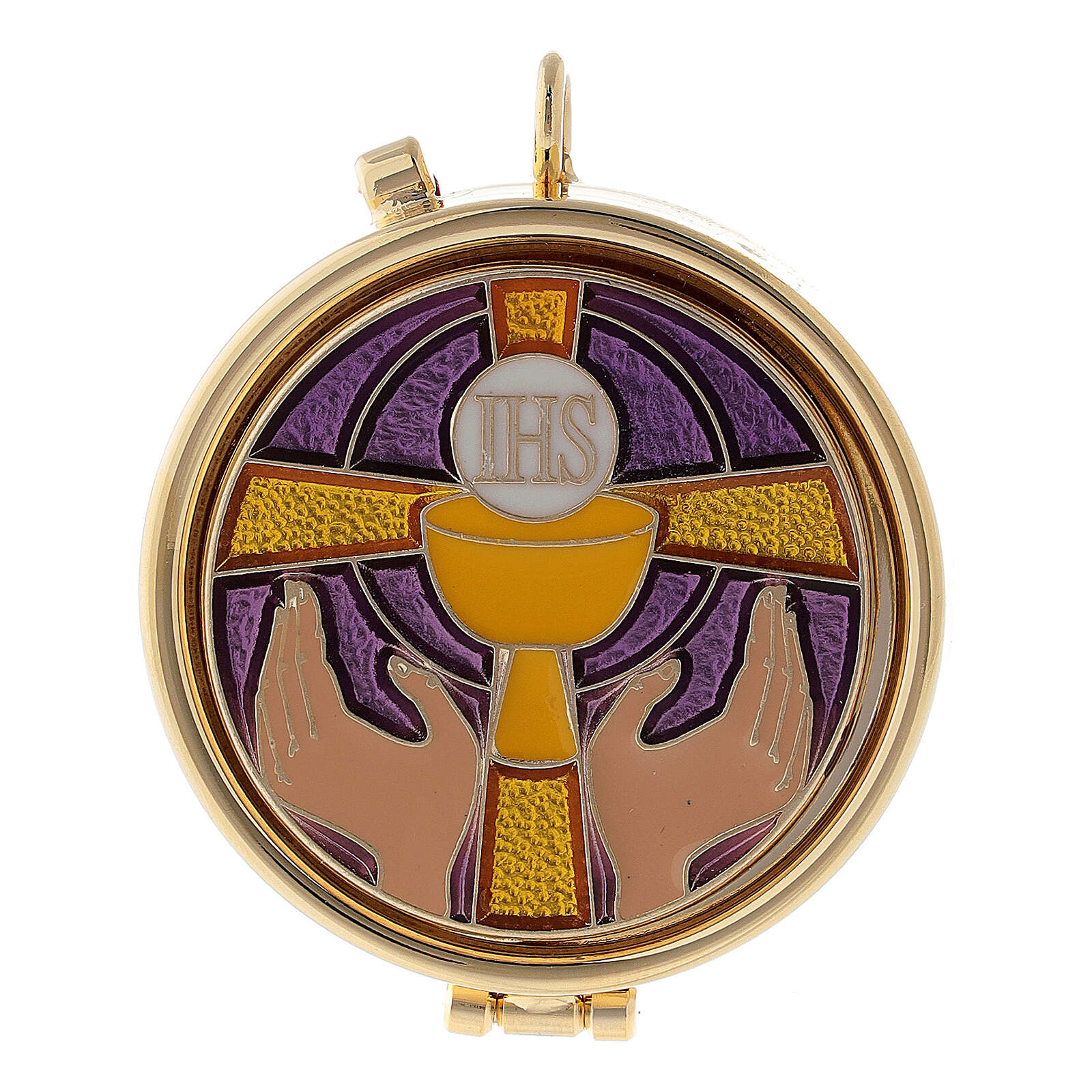 Cyborium pojemnik na komunikanty z metalu pozłacanego zarówno od wewnątrz jak i na zewnątrz. Posiada na nakrywce malowane emalią dekoracje przedstawiające symbole eucharystyczne: rozłożone ręce w ofercie i krzyż. Wyposażone jest też w oczko umożliwiające zawieszenie naczynka na szyi.