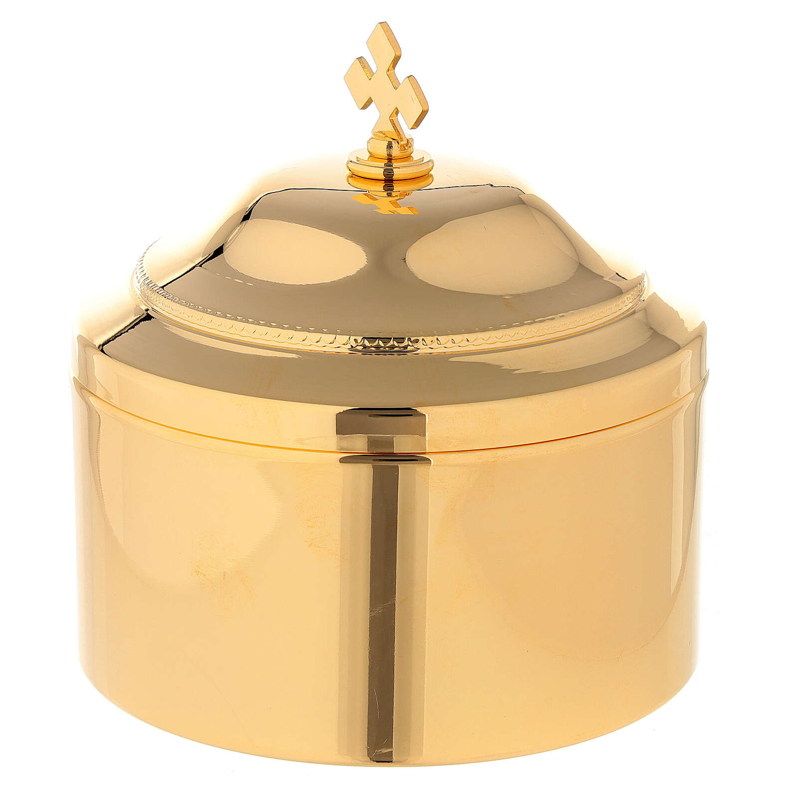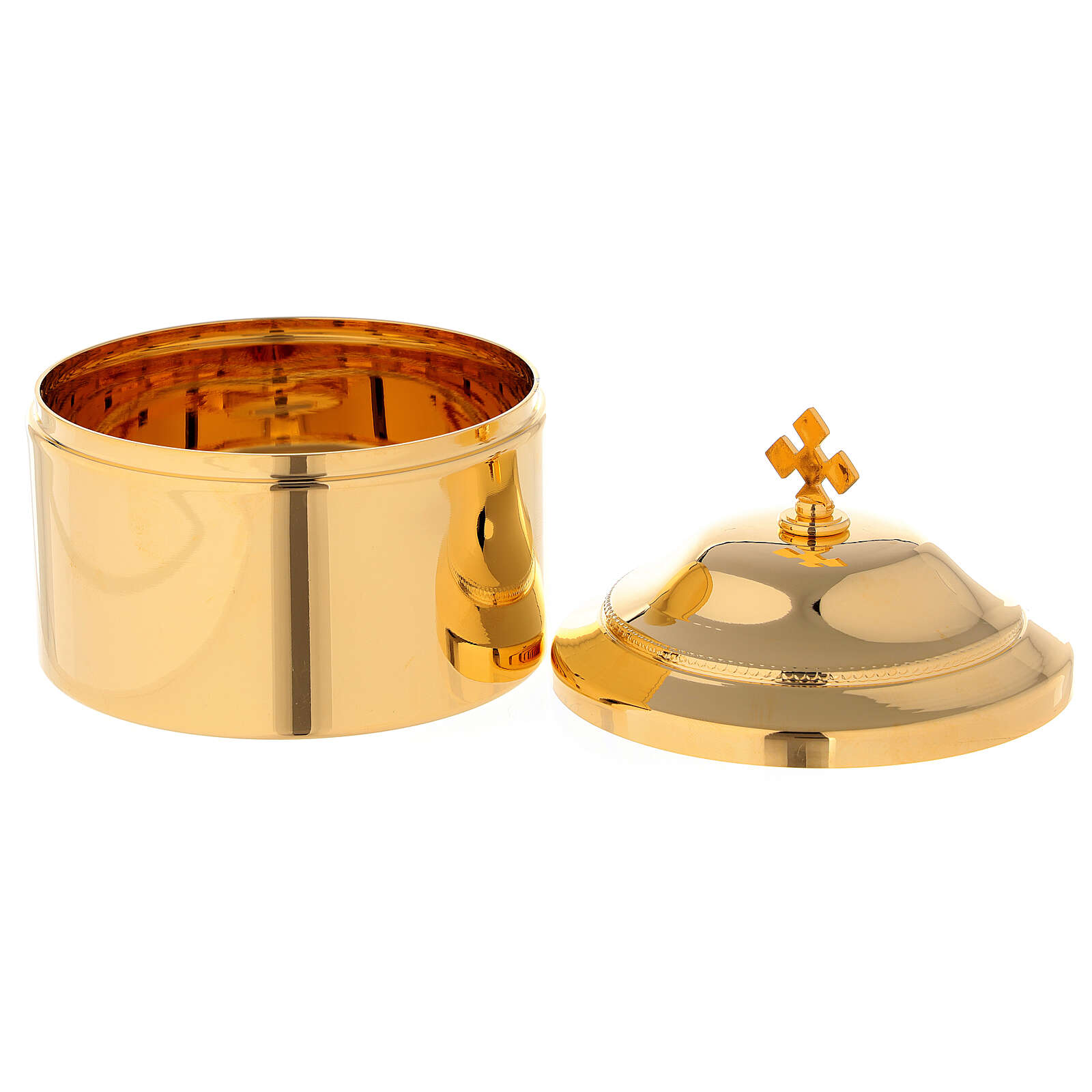 Hostiarka z pozłacanego mosiądzu z pokrywką i uchwytem w postaci krzyża na około 30 hostii.