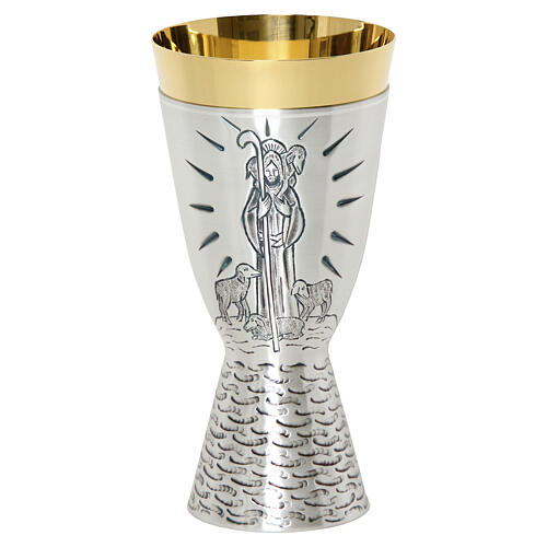 Kielich „Dobry Pasterz” o wysokości 18 cm, wykonany z posrebrzanego mosiądzu. Matowe wykończenie uwydatnia ręcznie wykonane zdobienia: centralną scenę z Dobrym Pasterzem otoczonym owcami podkreślają drobne, grawerowane promienie nadające aurę światła. Dolna część kielicha ma młotkowaną fakturę z falistym motywem, a wnętrze kielicha jest w całości pozłacane - zgodnie z wymaganiami do użytku liturgicznego.
