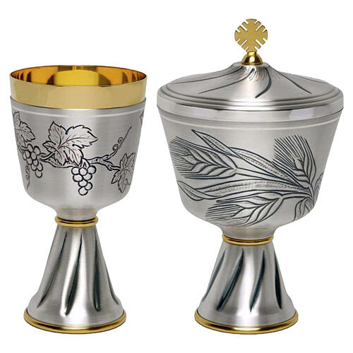 Kielich i puszka wykonane z mosiądzu, posrebrzane i ręcznie zdobione techniką rzeźbienia. Kielich ozdobiony jest motywem gron winogron z liśćmi i pędami, natomiast puszka posiada dekorację z kłosów zboża — obie formy nawiązują do symboliki Eucharystii. Na trzonach obu naczyń umieszczono subtelne, liniowe żłobienia, które dopełniają harmonijny i elegancki projekt.