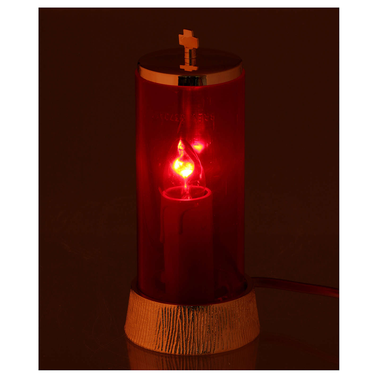 Otoczka płomienia wykonana jest z czerwonego plastiku, pokrywka zaś z krzyżem jest z pozłacanego mosiądzu. Również podstawa jest z zrealizowana z pozłacanego mosiądzu i składa się z: