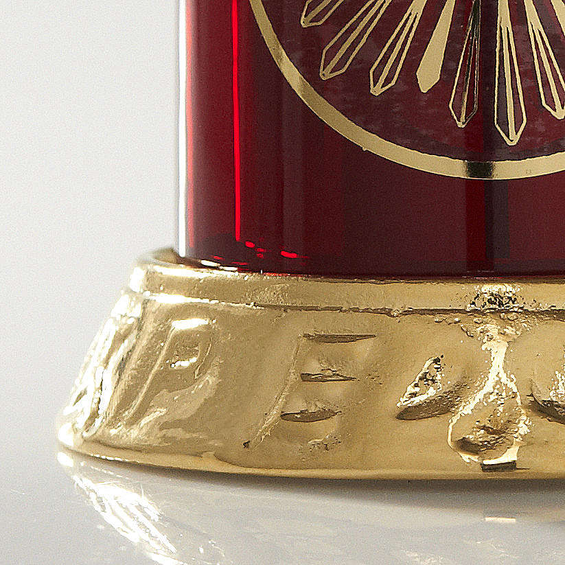 Ta lampka posiada oprawkę z ręcznie dmuchanego szkła w kolorze rubinowym. Podstawa została wykonana z pozłacanego i dekorowanego mosiądzu i składa się z:
