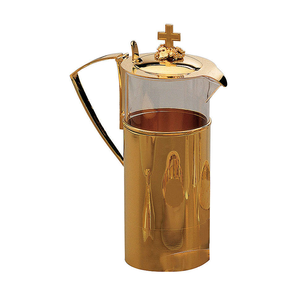 Dzban Molina wykonany ze szkła z wykończeniami z mosiądzu pozłacanego. Pokrywka zdobiona krzyżem z motywm winigron.