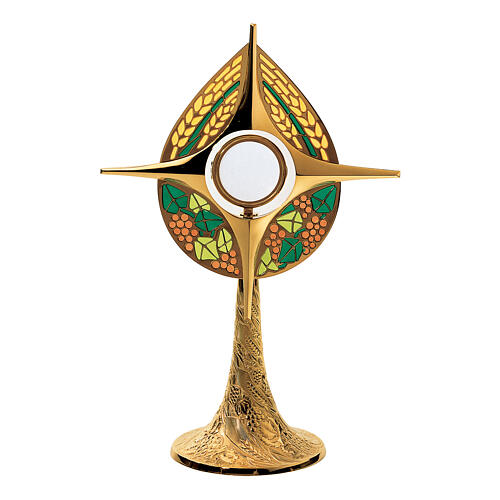 Monstrancja Molina w nowoczesnym stylu, wzory ziarna i winogron rzeźbione, 45 cm, mosiądz pozłacany.