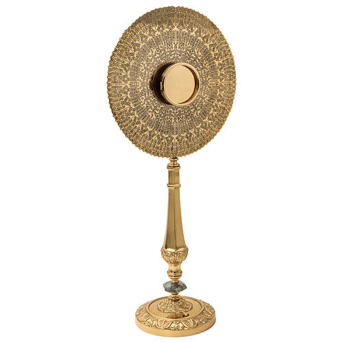 Monstrancja pozłacana, wykonana ręcznie we Włoszech, z ozdobioną podstawą z reliefowymi liśćmi, centralnym węzłem z żywicy w kolorze błękitno-szarym i precyzyjnie rzeźbionymi promieniami w motywy kwiatowe.