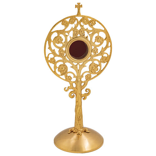 Korona drzewa, misternie wykonana w formie koła, otacza w środku relikwiarz, zaś na szczycie wznosi się krzyż, symbol wiary i zbawienia.