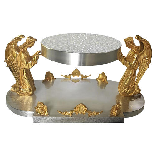 Po bokach znajdują się dwa pozłacane anioły podtrzymujące górną płytę, natomiast dłuższe boki ozdobiono naprzemiennie twarzami aniołów i dekoracyjnymi fryzami — kompozycja ta podkreśla uroczysty charakter wystawienia i estetykę liturgiczną.