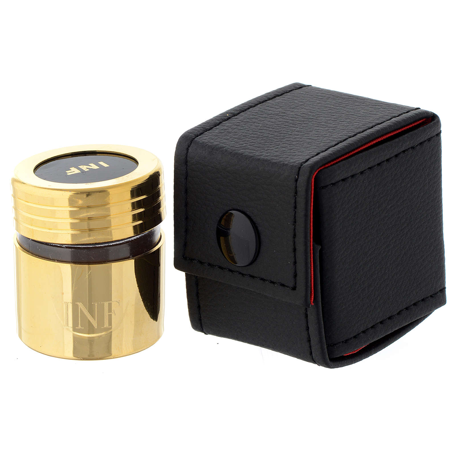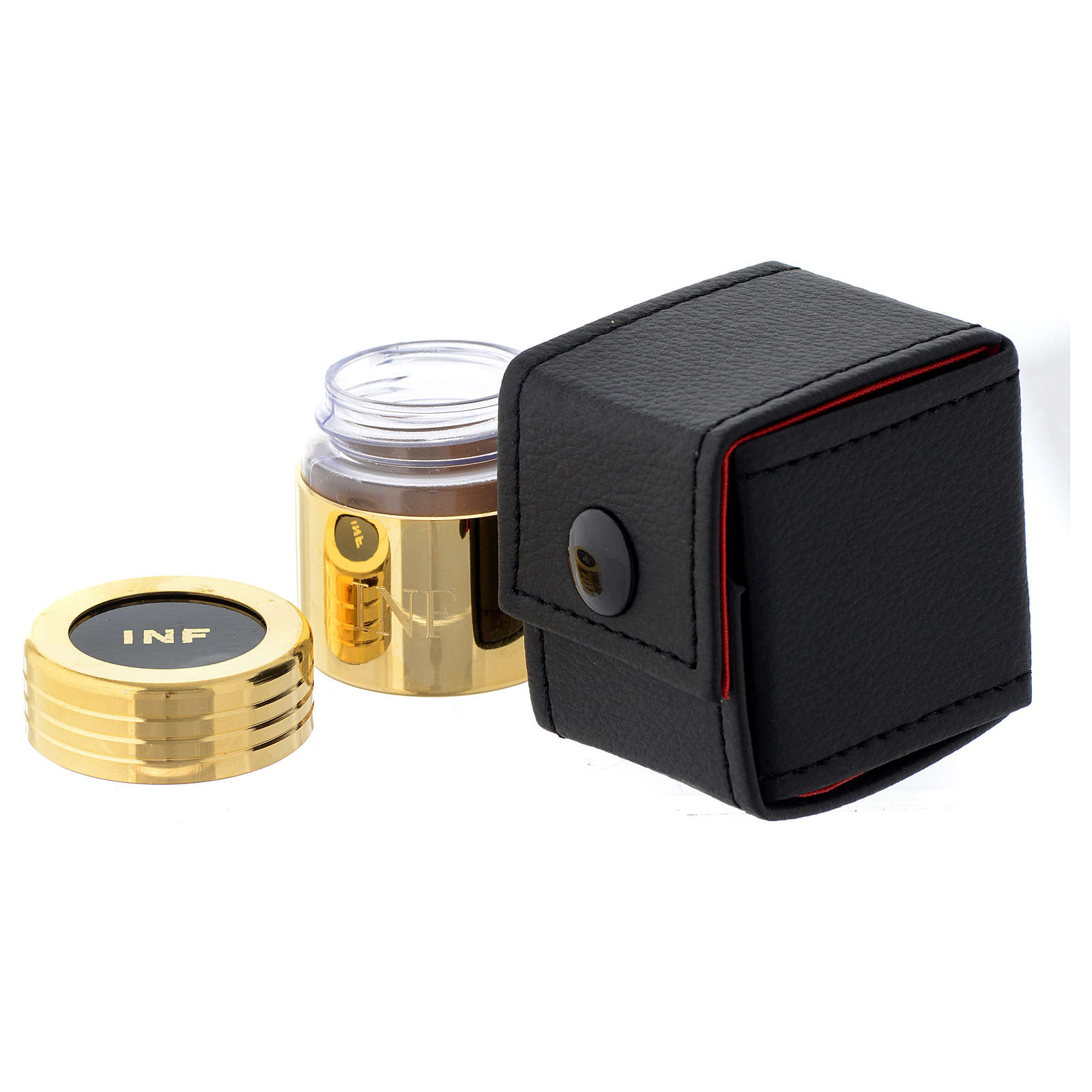 Etui i naczynko na olej chorych. Etui z czarnej tkaniny zawierające naczynko ze szkła w pozłacanym pancerzu i przeznaczone na pomieszczenie oleju chorych. Wysokość naczynka wynosi 4,5 cm. Na pokrywce widnieje grawer INF. Pojemnik na olej święty zrealizowany w rzemieślniczy sposób w małej firmie z wieloletnim doświadczeniem w wykonaniu wyposażenia sakralnego.