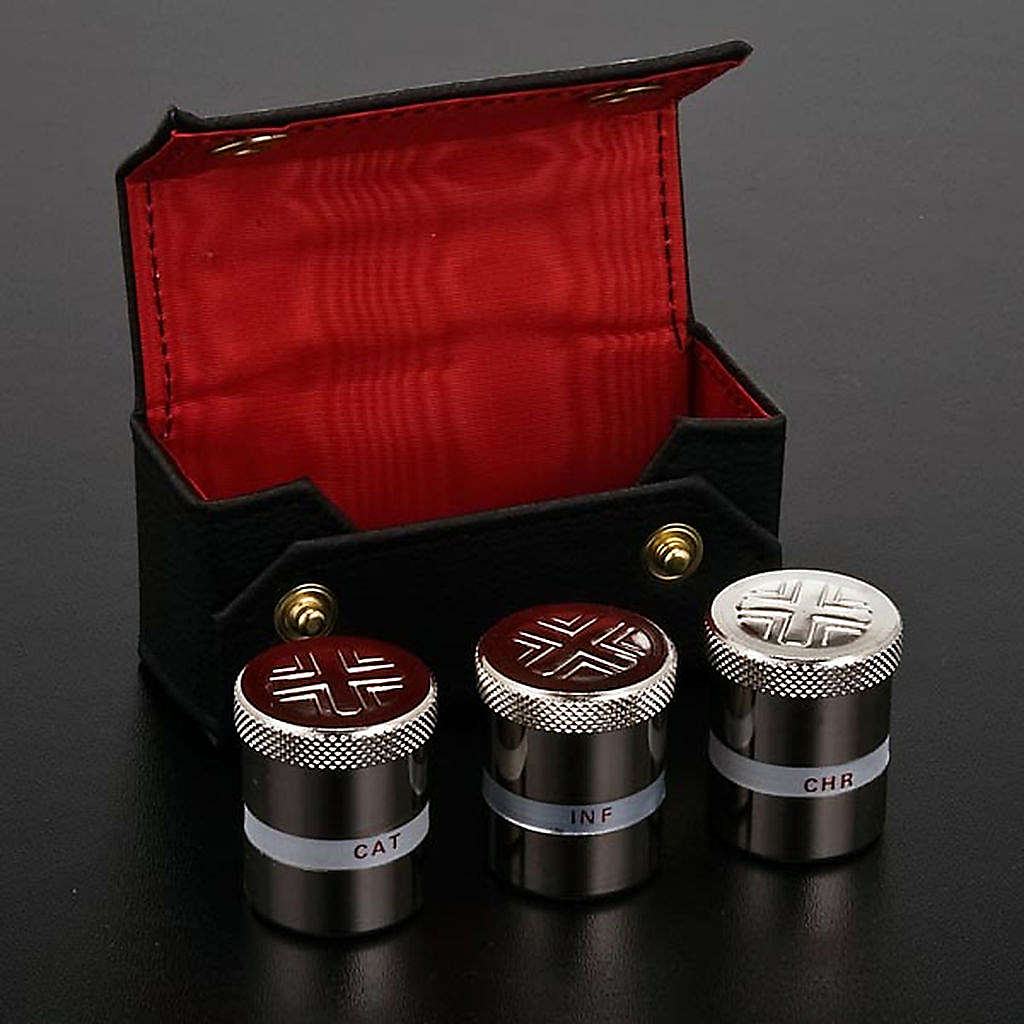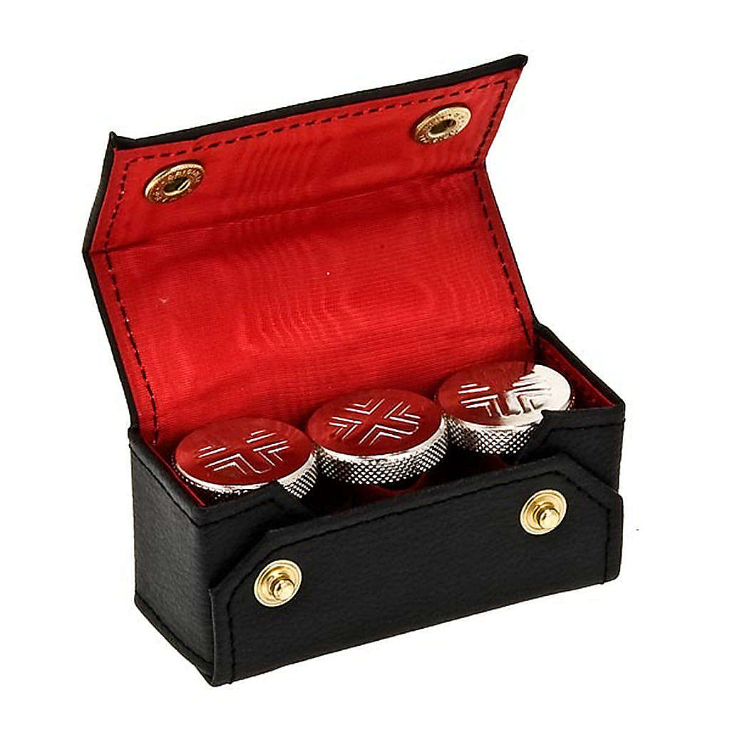 Pokrowiec z 3 naczynkami z posrebrzanego metalu na Oleje Święte.