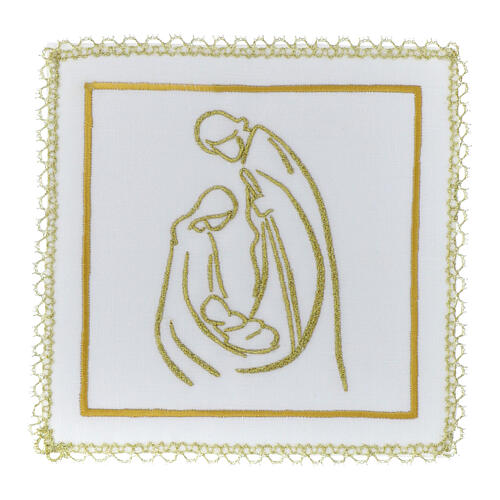 Elegancki zestaw bielizny kielichowej do ołtarza z haftem Świętej Rodziny ze sceny narodzenia, wykonany z 50% bawełny, 40% jedwabiu i 10% wiskozy. Wyjątkowe ręcznie wykonane paramenty włoskiej szwalni specjalizującej się in tej dziedzinie.