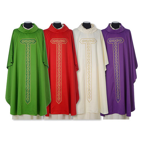 Ornat wykonany w Polsce z pasem w kształcie krzyża i złotym haftem maszynowym, z włoskim kołnierzykiem i pasującą do niego stułą.