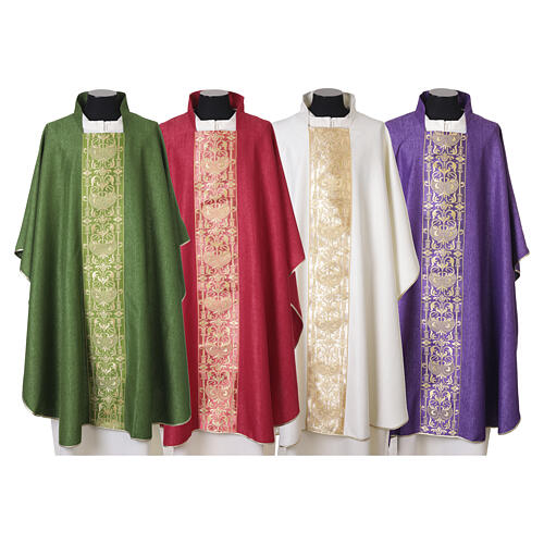 Ornat liturgiczny z tkaniny o subtelnym efekcie fiammato (nierównej grubości), z ozdobnym, złotym, centralnym pasem.