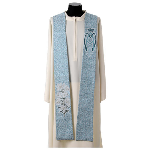 Stuła błękitna w szpic, z dekoracjami w kształcie symbolu Maryjnego i lilii.