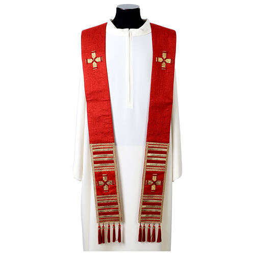 Elegancki i wyrafinowany parament liturgiczny, wykonany z wysokogatunkowych materiałów i niezawodnej ręcznej roboty. Niezwykły design ze złotą francuską pasmanterią i czerwonym aksamitem tworzącym dwie krzyże po obu stronach, ozdobione czerwonymi kryształami, dodający luksus i blasku. Dekoracyjny krzyż umieszczony na górze i z tyłu stuły nadaje równowagi i harmonii. Końce stuły ozdobione czerwonymi chwostami i złotymi kulkami, dodającym oryginalności.