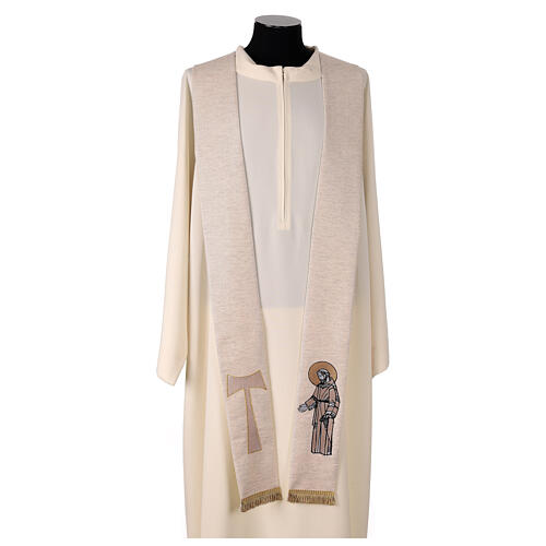 Stuła franciszkańska z eleganckim haftem na tle w kolorze kości słoniowej oddającym hołd św. Franciszkowi. Z jednej strony haftowane są symbole, które oddają istotę duchowości franciszkańskiej: tau - symbol pokoju i kontemplacji, otoczony złotym lamówieniem, podkreślającym jego widoczność i znaczenie, a z drugiej pełna figura św. Franciszka, przywołująca jego pobożność i pokorę.