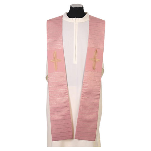 Stuła kapłańska w kolorze różowym z haftowanym, stylizowanym krzyżem haftowanym złotą nicią, wykonana z mieszanki wełny, wiskozy i poliestru.