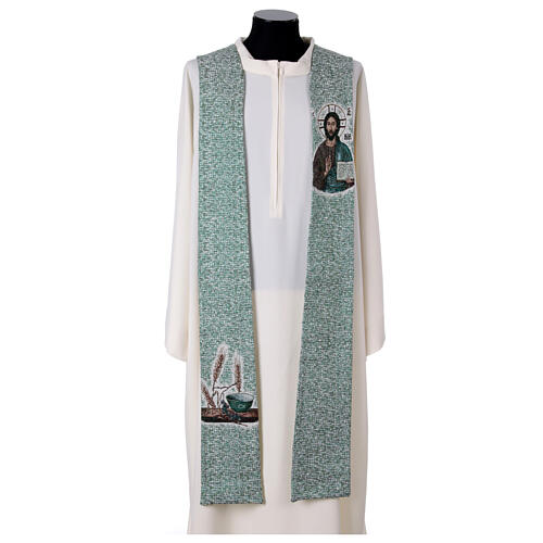 Stuła kapłańska zakończona wierzchołkiem poświęcona Chrystusowi Pantokratorowi i symbolom eucharystycznym, wykonana na krosnach przez włoskich rzemieślników.