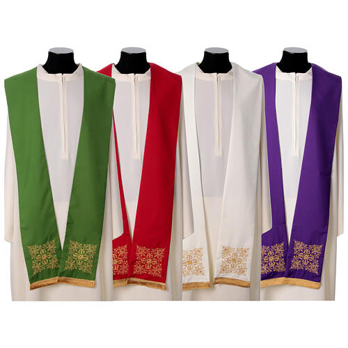 Parament kapłański wykonany z lekkiego materiału Vatican, dostępny w 4 kolorach liturgicznych. Na obu końcach stuły znajdują się misternie haftowane kwadraty z motywami kwiatowymi i pnączami formującymi krzyż, który jest dodatkowo ozdobiony kryształami.