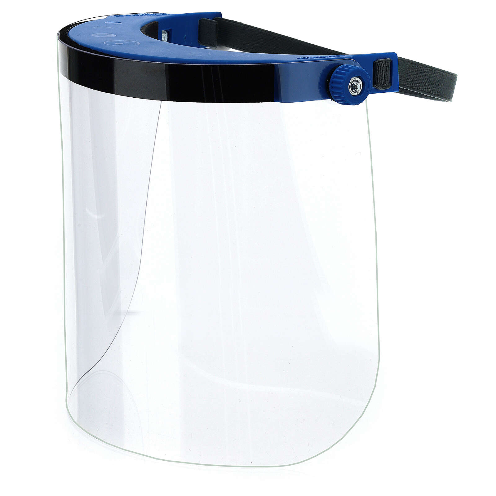 Przyłbica ochronna: osłona twarzy zrealizowana z przezroczystego plastiku (poliwęglan).