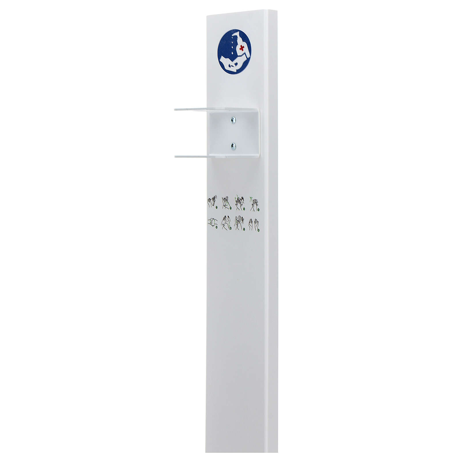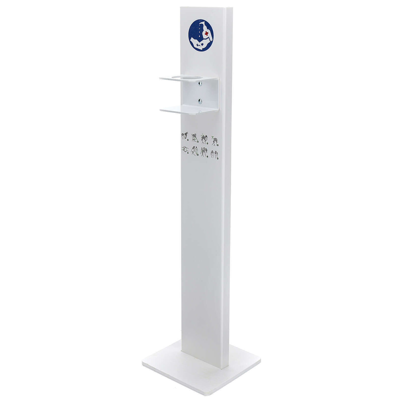 Stojak jest stabilny i wolno stojący. Zaleca się oprzeć kanister z doładowaniem żelu do dezynfekcji z tyłu struktury dla wygody (tym samym doda jej stabilności): został on zaprojektowany, aby móc ukryć taki pojemnik zapasowy.