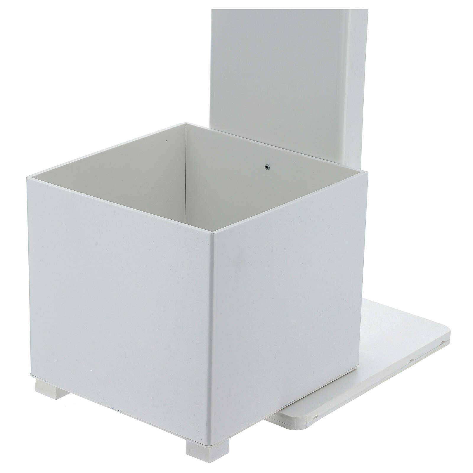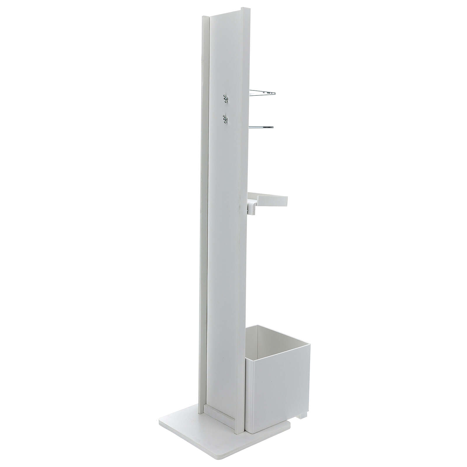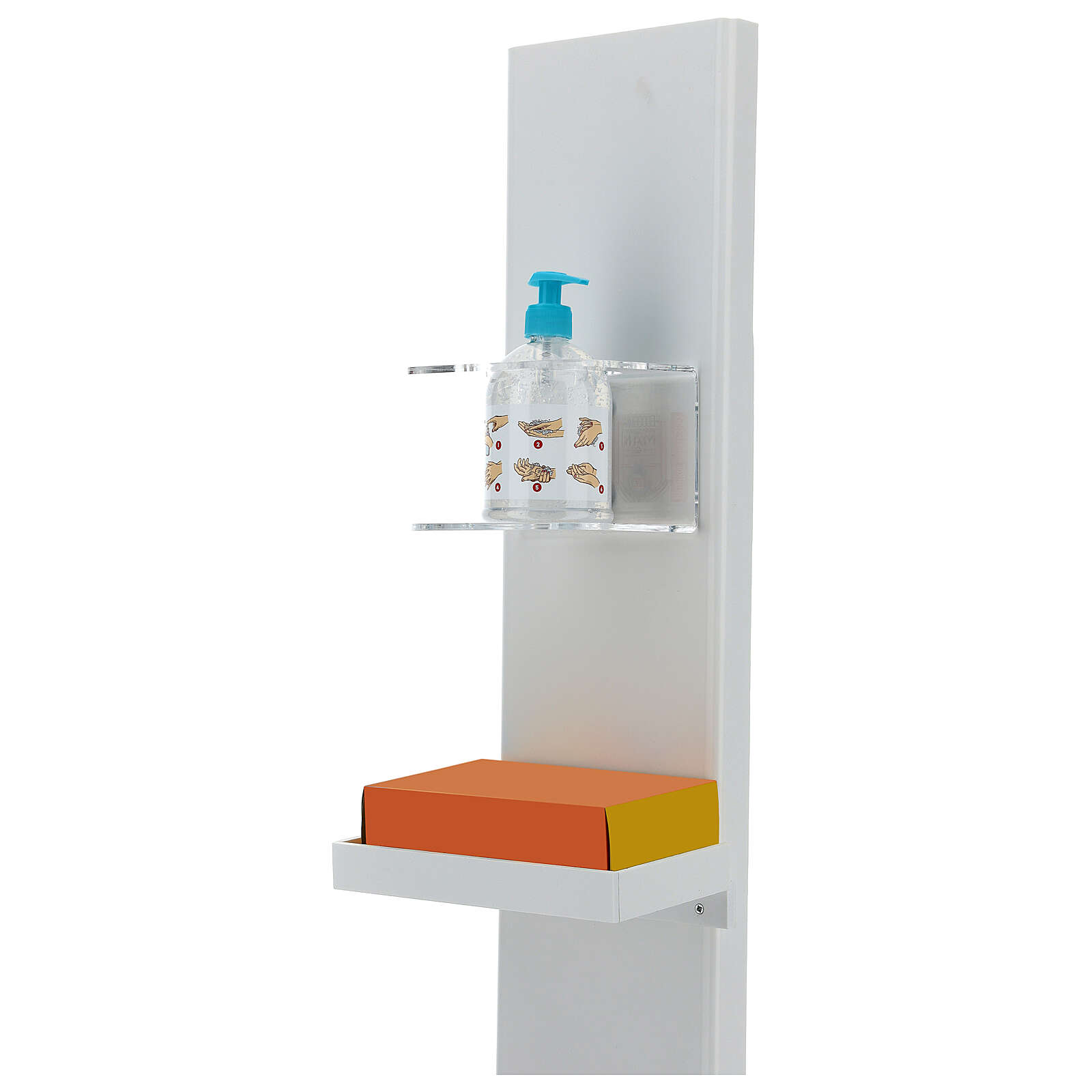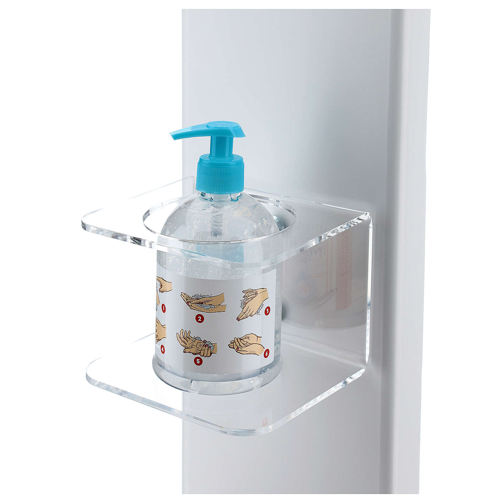 Stojak jest stabilny i wolno stojący. Zaleca się oprzeć kanister z zapasem żelu do dezynfekcji z tyłu struktury dla wygody (tym samym doda jej stabilności): został on zaprojektowany, aby móc ukryć taki pojemnik zapasowy.