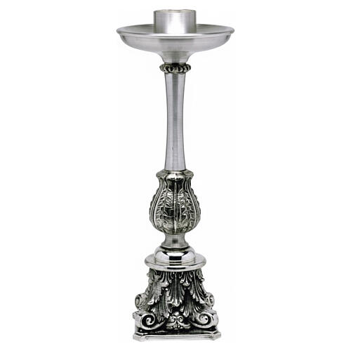 Świecznik metalowy — podstawa świecy w stylu barokowym z ornamentem liści akantu, 23 cm, tuleja 40 mm.