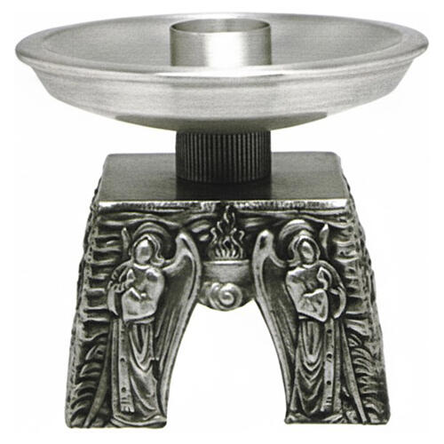 Elegancki świecznik ołtarzowy wykonany we Włoszech z posrebrzanego mosiądzu. Podstawa o kształcie kwadratu (13 × 13 cm) jest ozdobiona reliefowymi wizerunkami aniołów na czterech bokach, rozmieszczonymi wokół centralnego płomienia — symbolu światła i modlitwy. Górna część posiada szeroki talerz na spływający wosk oraz tuleja na świecę o średnicy 40 mm, kompatybilne ze standardowymi świecami liturgicznymi.