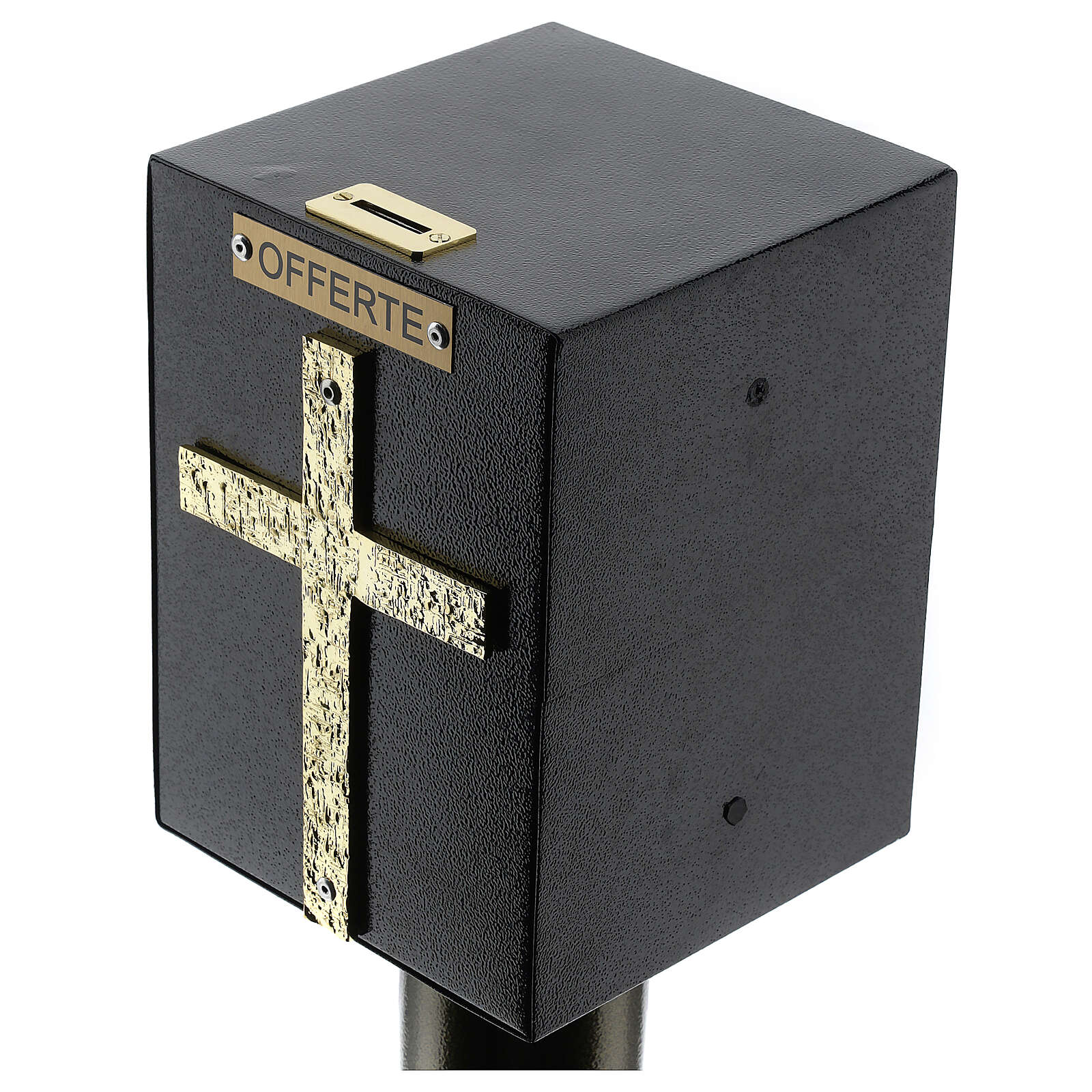 Stojąca skrzynka na oferty i intencje mszalne do kościołów i miejsc sakralnych zrealizowana ręcznie z metalu w kolorze brązu, lakierowana na gorąco.