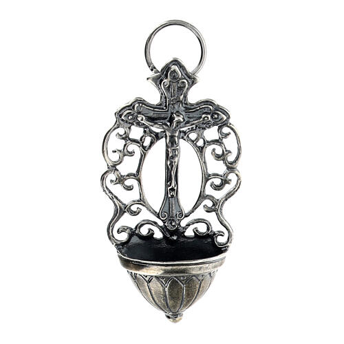 Kropielnica z srebra 800 w kształcie krzyża trójlistnego z reliefem ciała Chrystusa.
