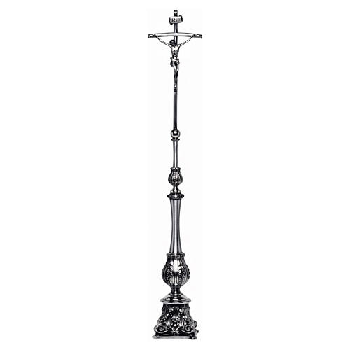 Krucyfiks ołtarzowy wykonany we Włoszech, zaprojektowany jako element zestawu liturgicznego dopasowanego stylistycznie do świeczników o identycznym wykończeniu i dekorze.