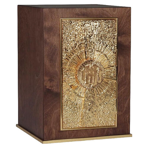 Tabernakulum na mensę z motywem IHS - z drewna mahoniowego, prostokątne drzwi, 40 x 30 x 30 cm