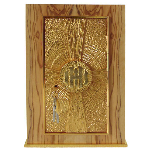 Tabernakulum ołtarzowe – drewno oliwne, drzwi z promienistym monogramem IHS, 40 × 30 × 30 cm.