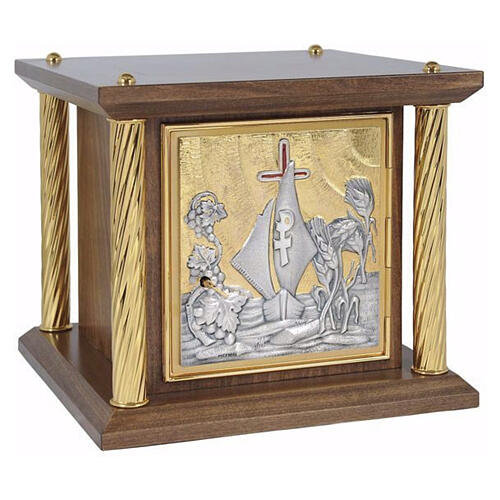 Tabernakulum wykonane z drewna mahoniowego oraz elementów mosiężnych, produkowane we Włoszech przez firmę specjalizującą się w wyposażeniu sakralnym. Konstrukcję wyznaczają cztery boczne kolumny w kolorze mosiądzu złoconego, które tworzą wyraźny akcent wizualny. Drzwiczki, wykonane z mosiądzu złoconego i srebrzonego, zdobi scena inspirowana Jeziorem Tyberiadzkim: łódź żaglowa oraz symbole eucharyst...