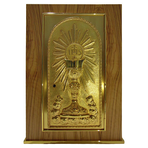 Tabernakulum z drewna oliwnego z dekoracją kielicha i hostii IHS, 40x30x30 cm